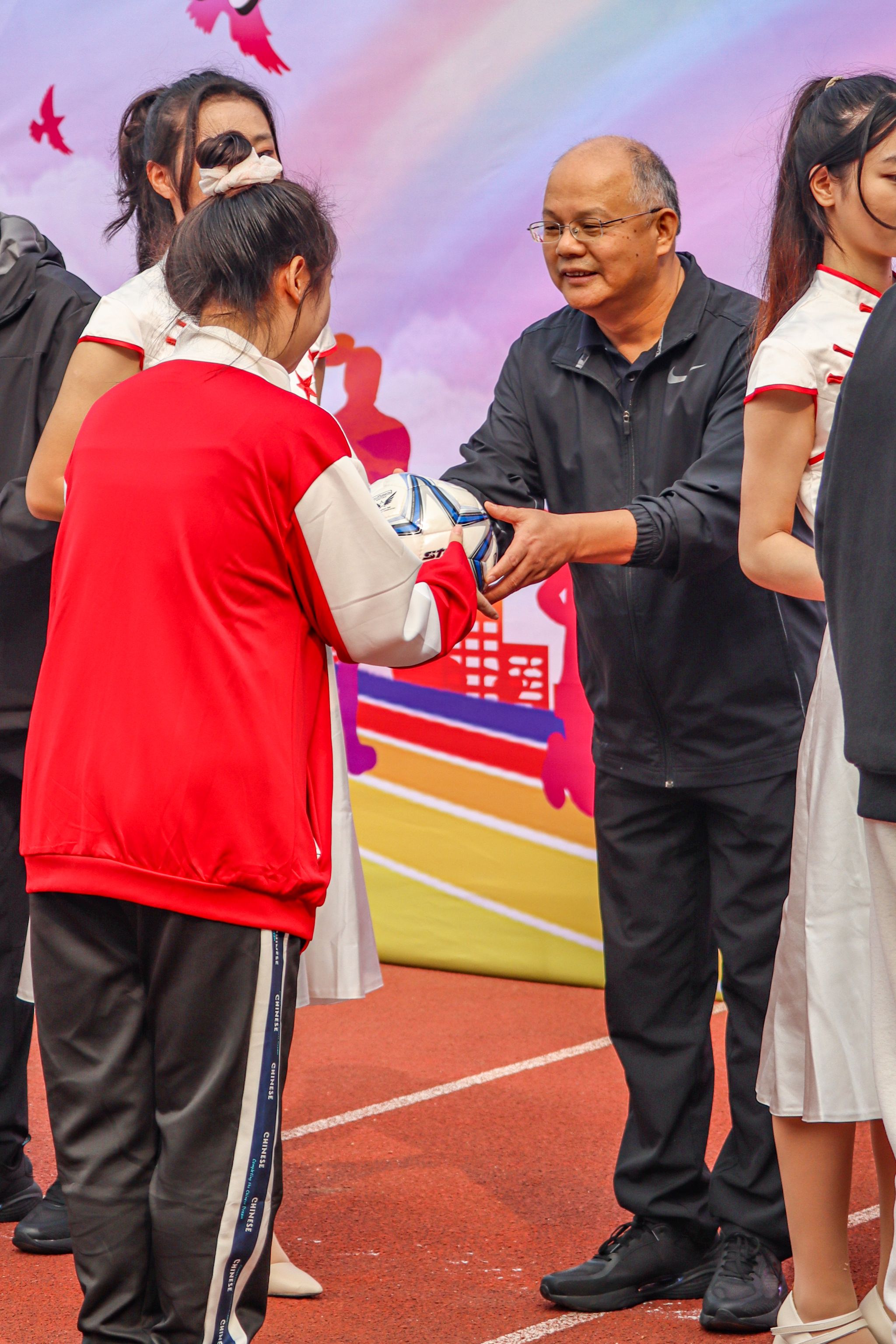 校长倪红卫赠与学生代表足球 杨曜恺摄