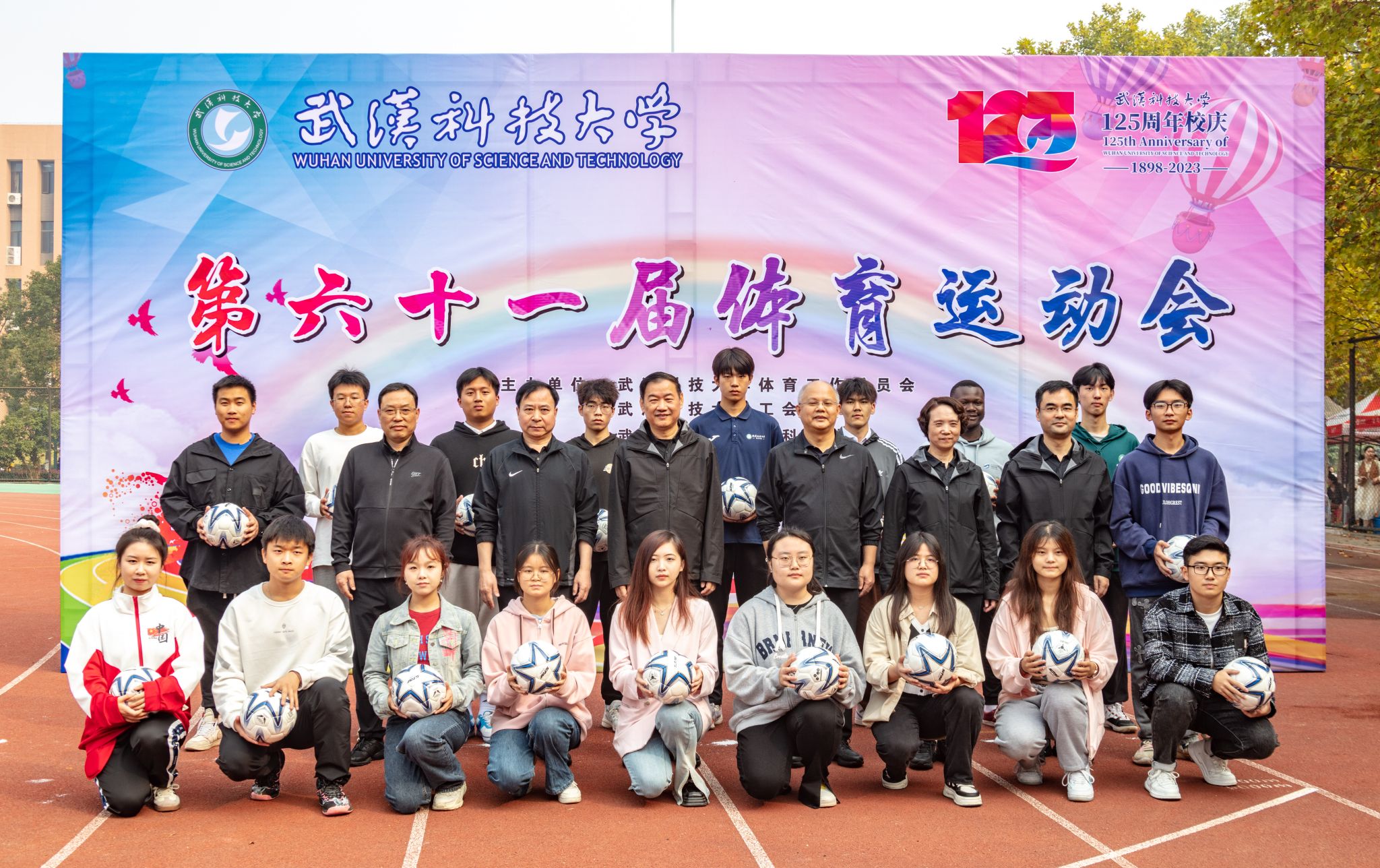 校领导和学院代表学生赠送足球并合影 杨佳伟摄