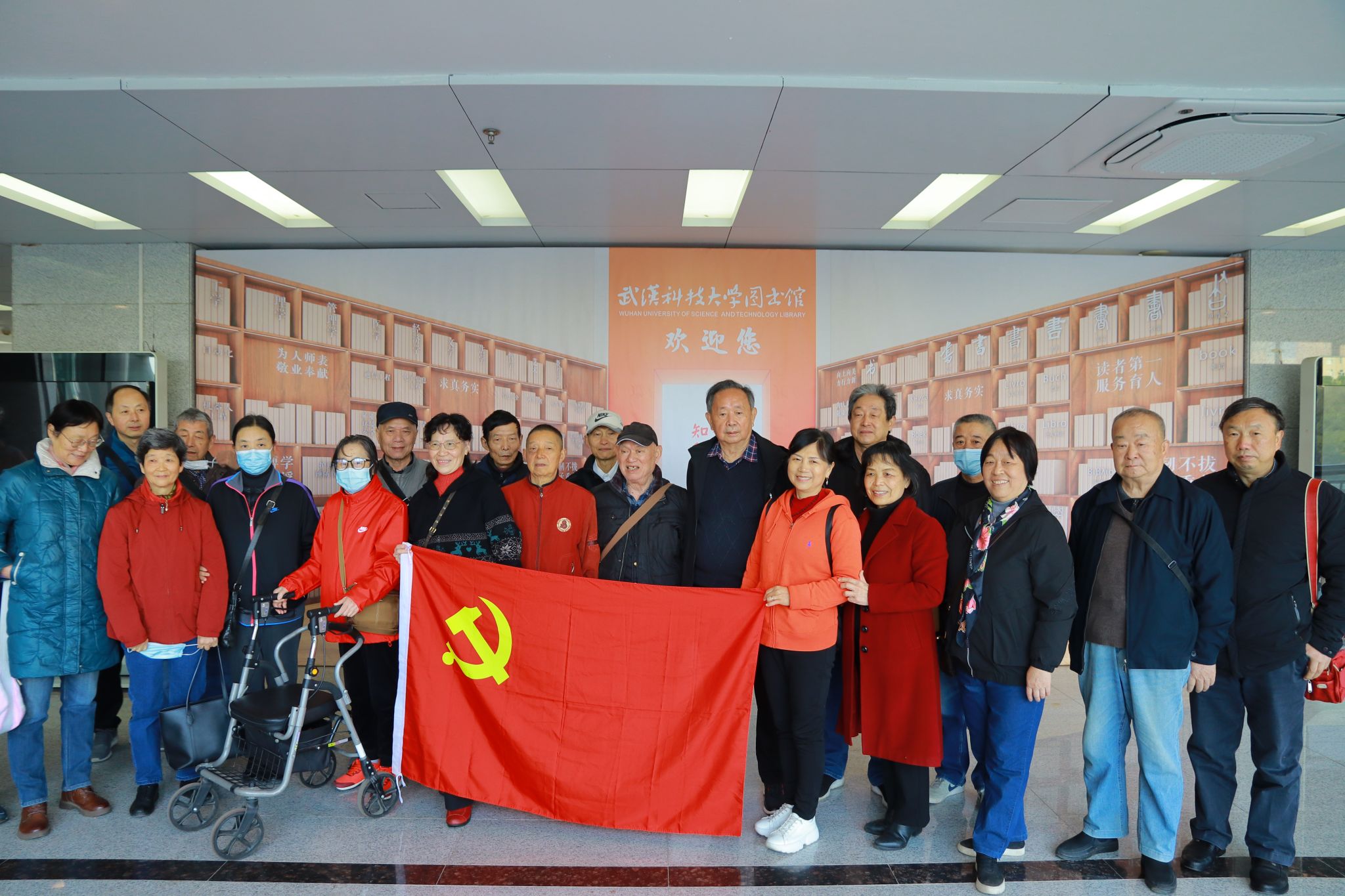 退休党员在打卡墙前合影留念 江子琪摄