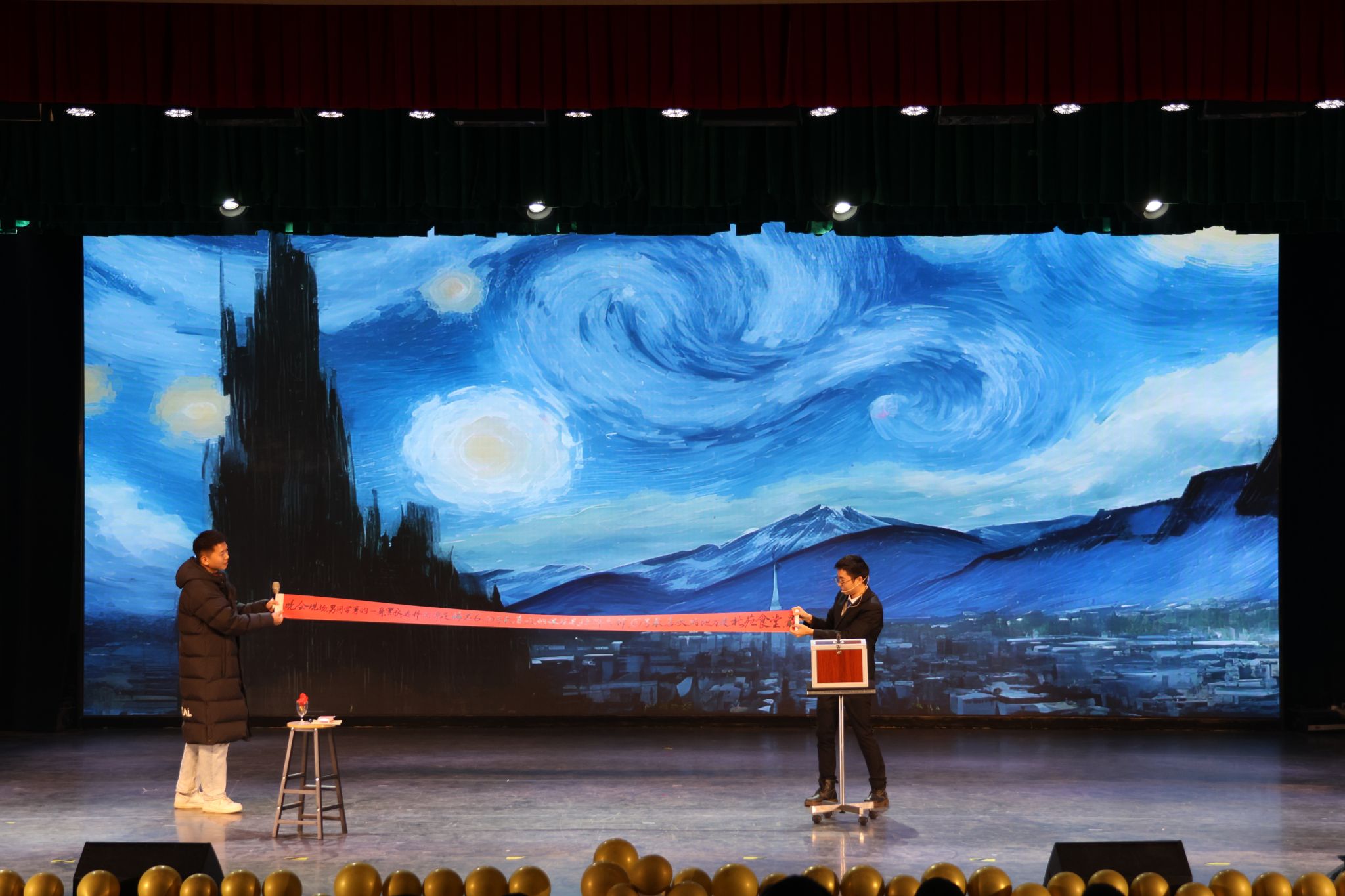 研究生各培养单位、研究生舞蹈队、武汉说唱团、大学生艺术团以及魔术协会共同为现场观众带来精彩纷呈的晚会节目。快板《比》、歌曲《星星》、舞蹈串烧《Hot Issue》《Hype Boy》 《Mix Pop》将晚会引入高潮。晚会设置多轮抽奖和互动环节,赵凯、冯涛、毛宝胜作为抽奖嘉宾为现场观众抽取奖品。音乐声、欢笑声、喝彩声交织在一起,形成了一曲欢乐的交响乐,现场观众都沉浸在欢愉的氛围中。
