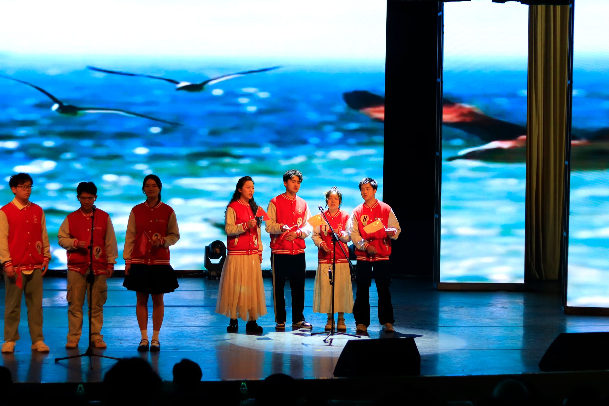 赛前大合唱挥舞国旗 马茜云摄