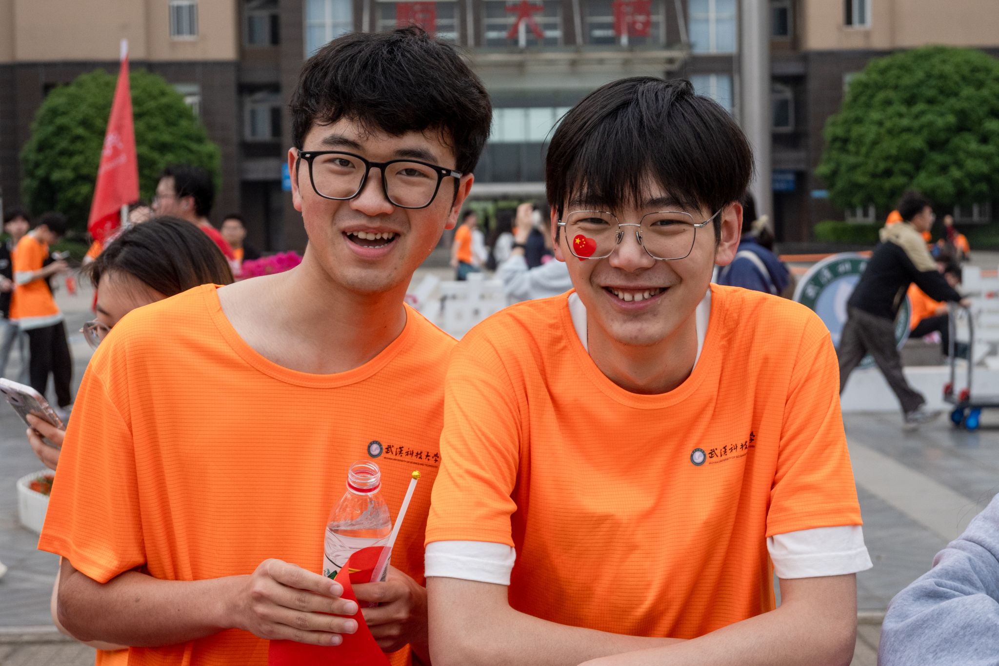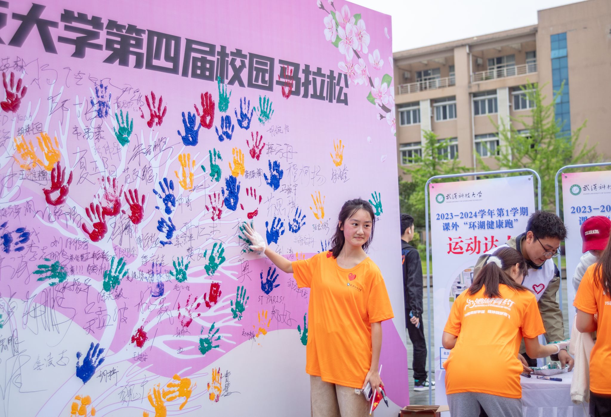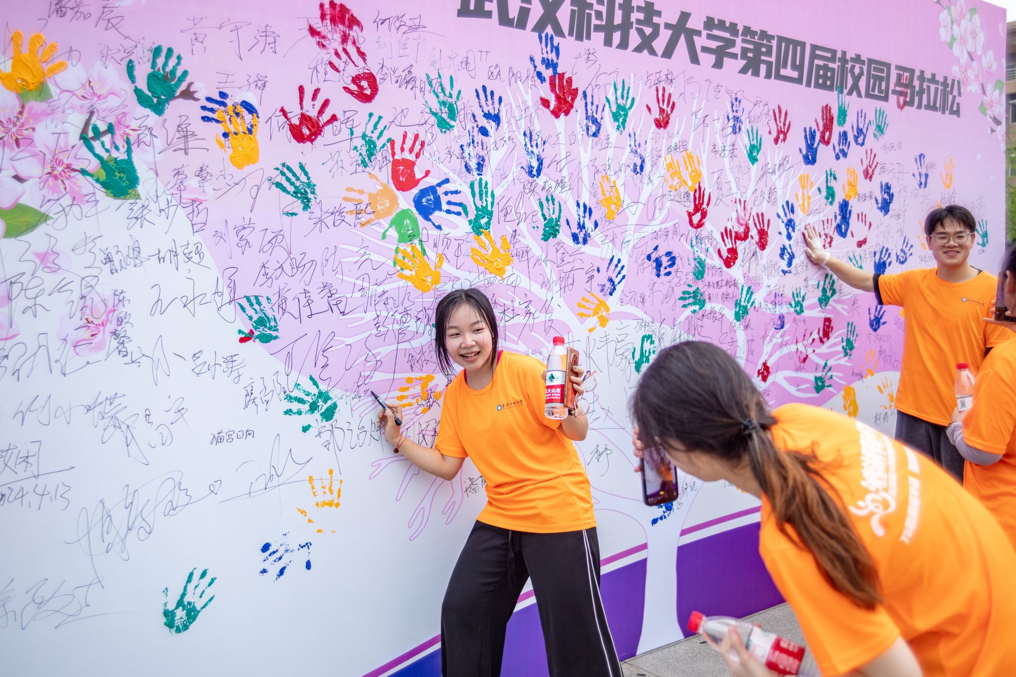 参与马拉松的同学签名墙上签名并合影 杨佳伟摄