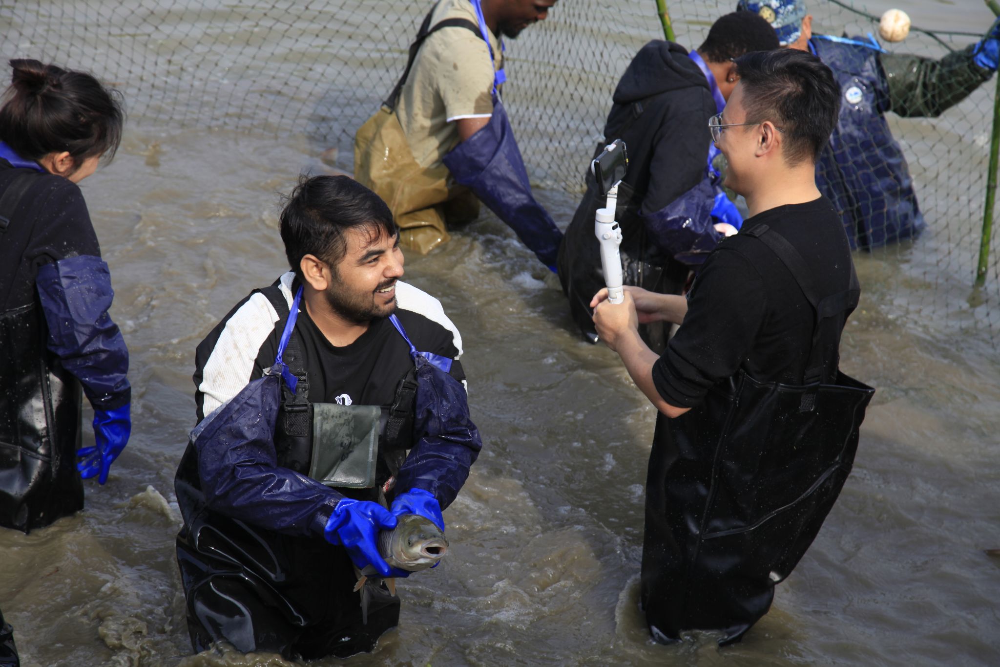 留学生下水捞鱼 吴毅萌摄