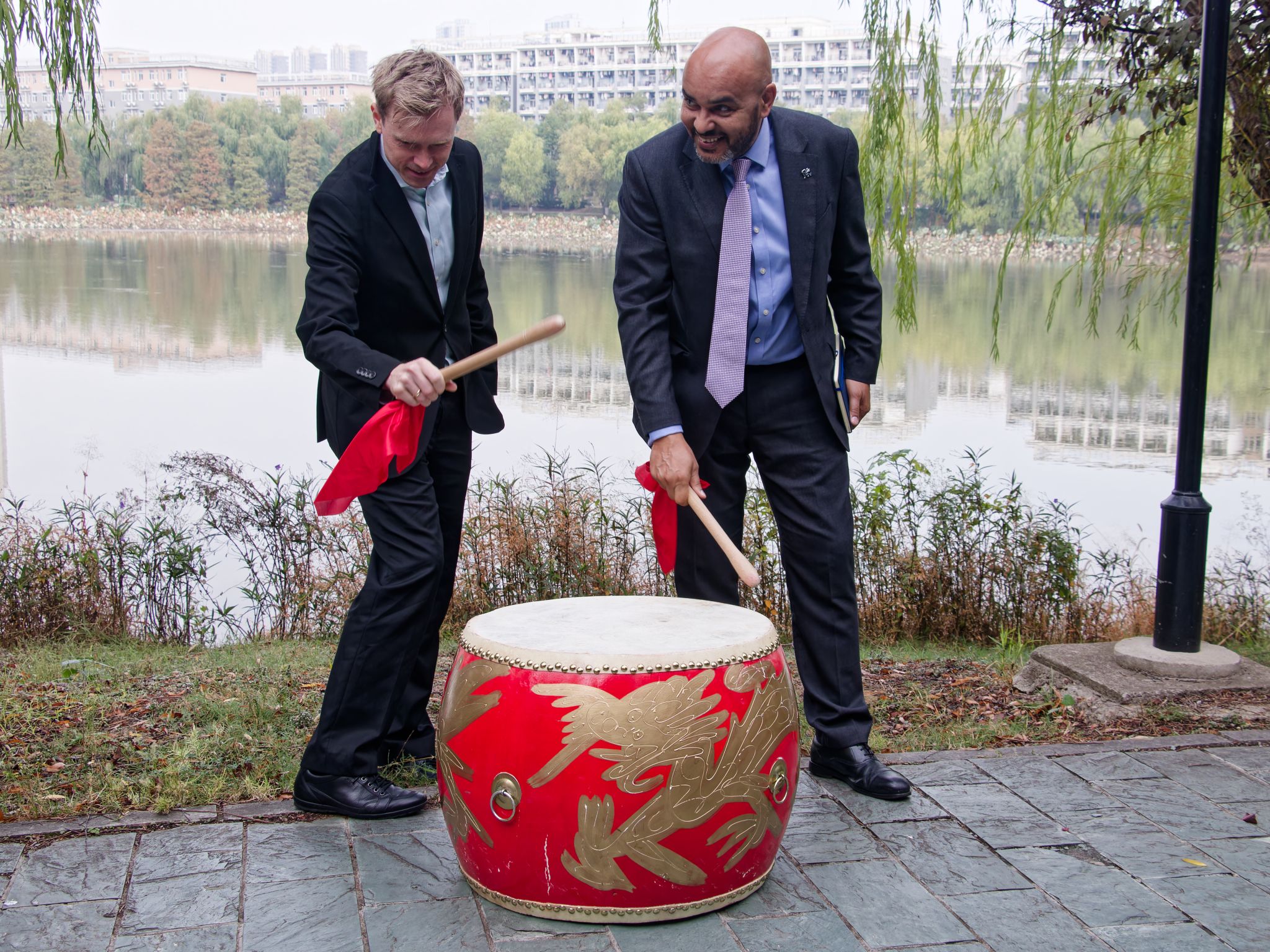 英国伯明翰城市大学校领导击鼓 孙正恒摄