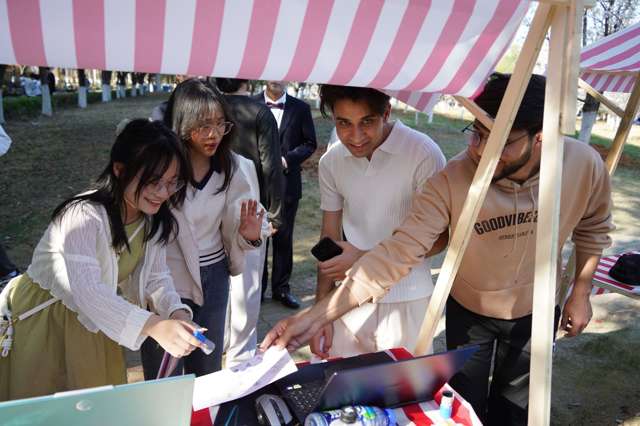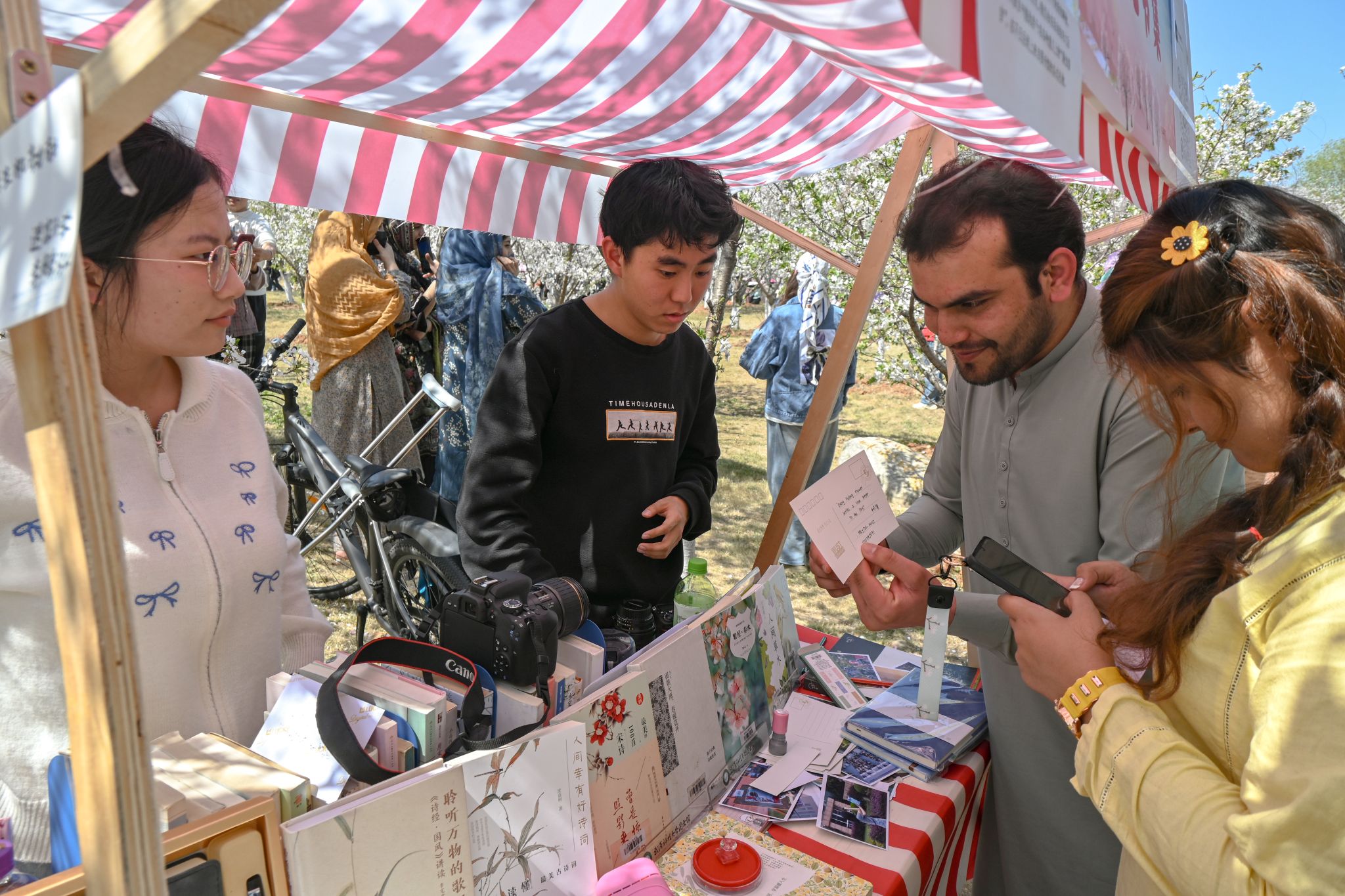 大艺团成员向留学生介绍樱花节 孙正恒摄