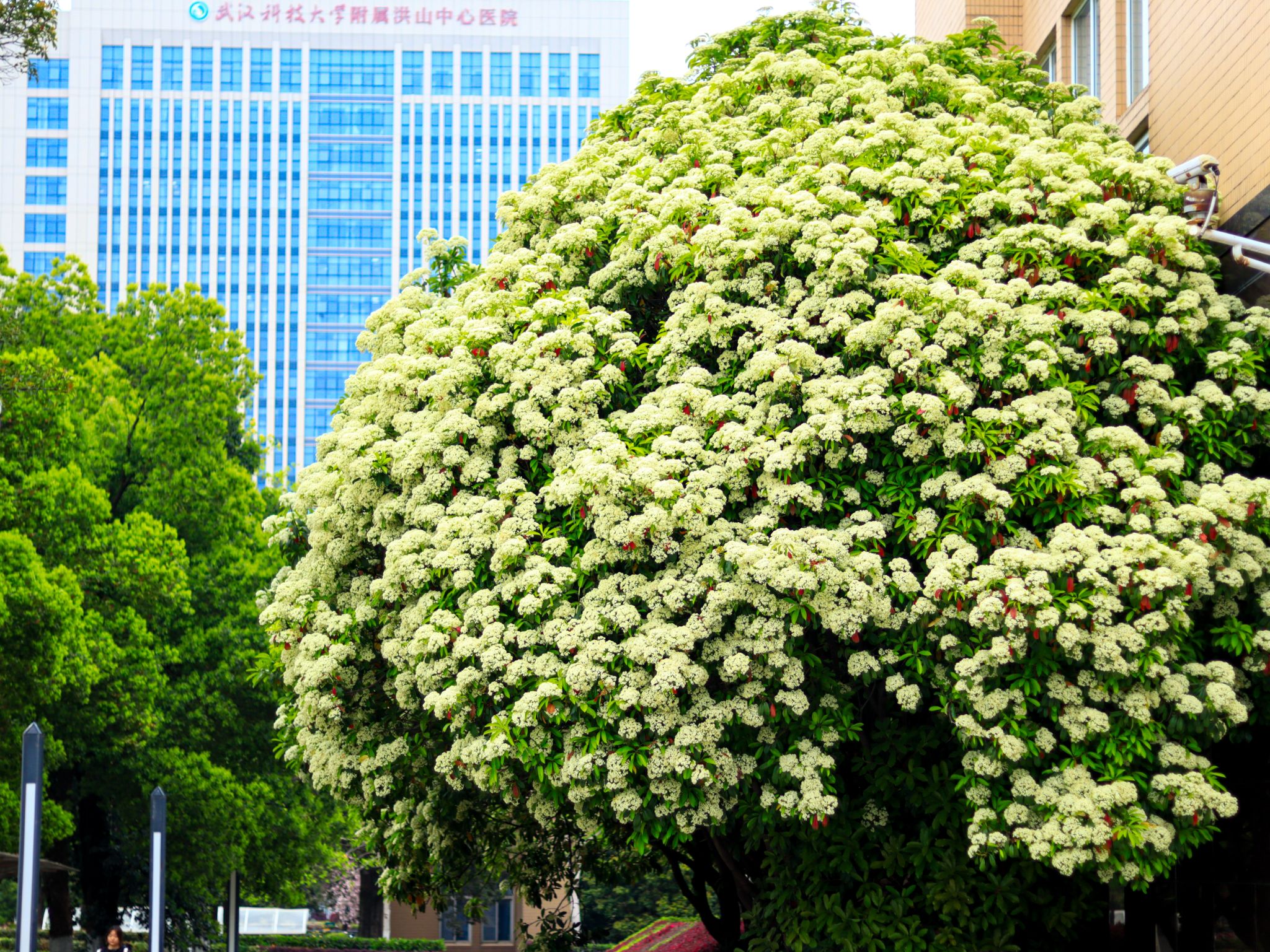 石楠花是蔷薇科石楠属常绿灌木或小乔木,别名千年红、扇骨木。叶片革质,长椭圆形,春季开花,白色小花密集成顶生复伞房花序,虽花形小巧,但花量繁多。石楠花喜光耐旱,抗病虫害能力强,常作为城市绿化树种,可净化空气、隔离噪音其花语是“孤寂、庄严”。花期在4-5月,Beat365官网教一楼、教二楼周边和沁心岛可见。