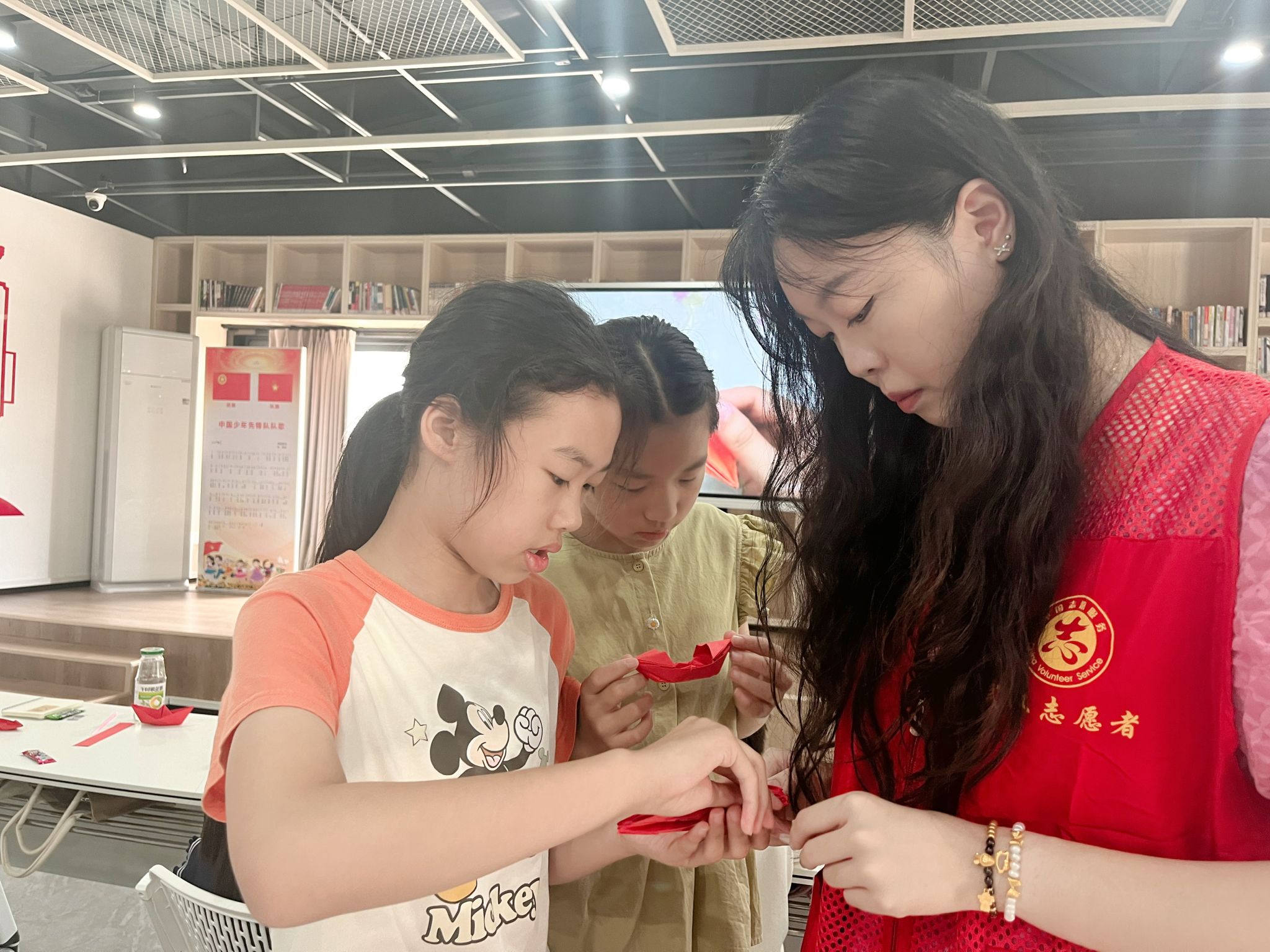 汉沙社区新时代文明实践站活动中心,刘子欣在教漆扇制作全景 王翔宇摄