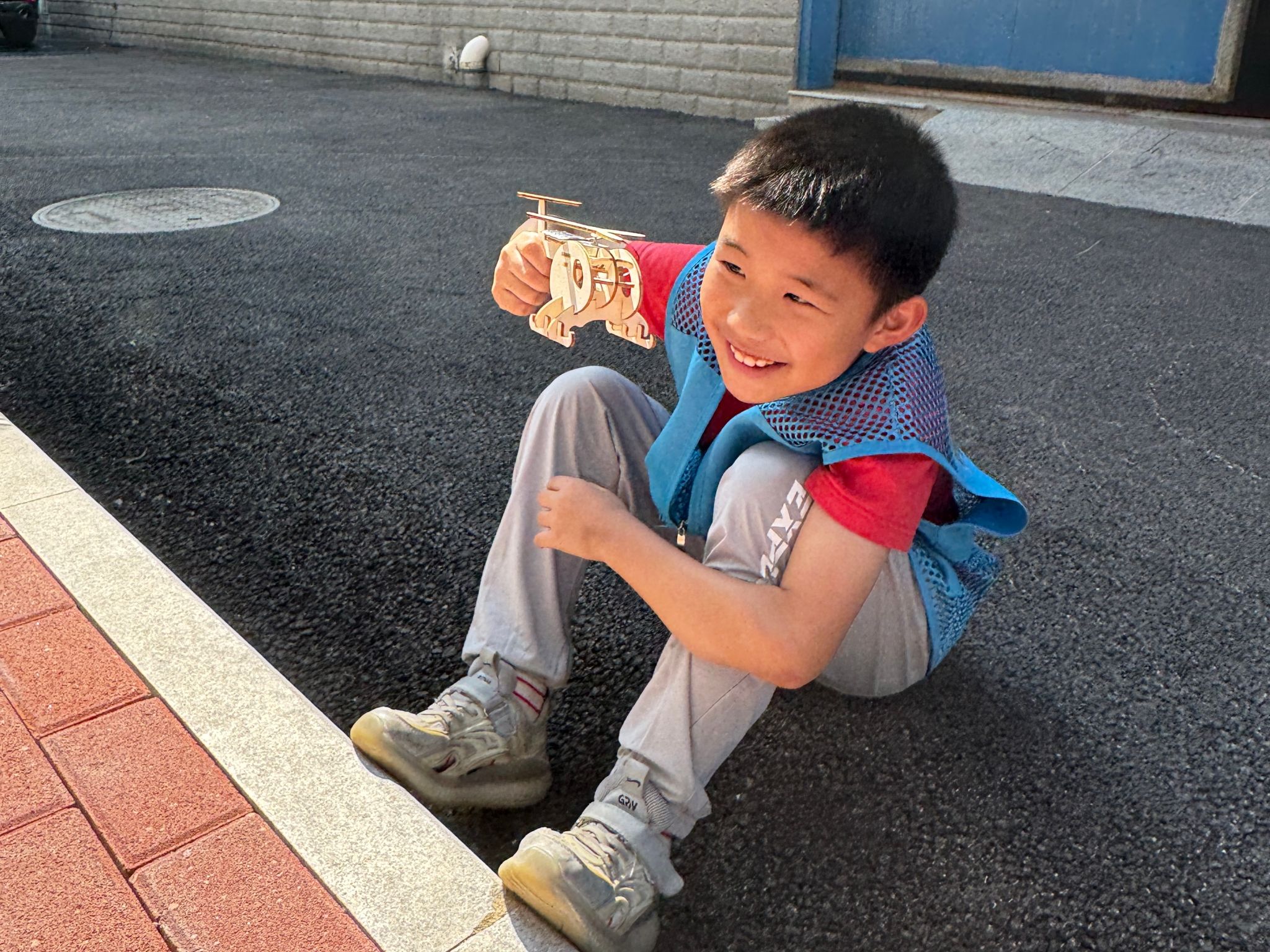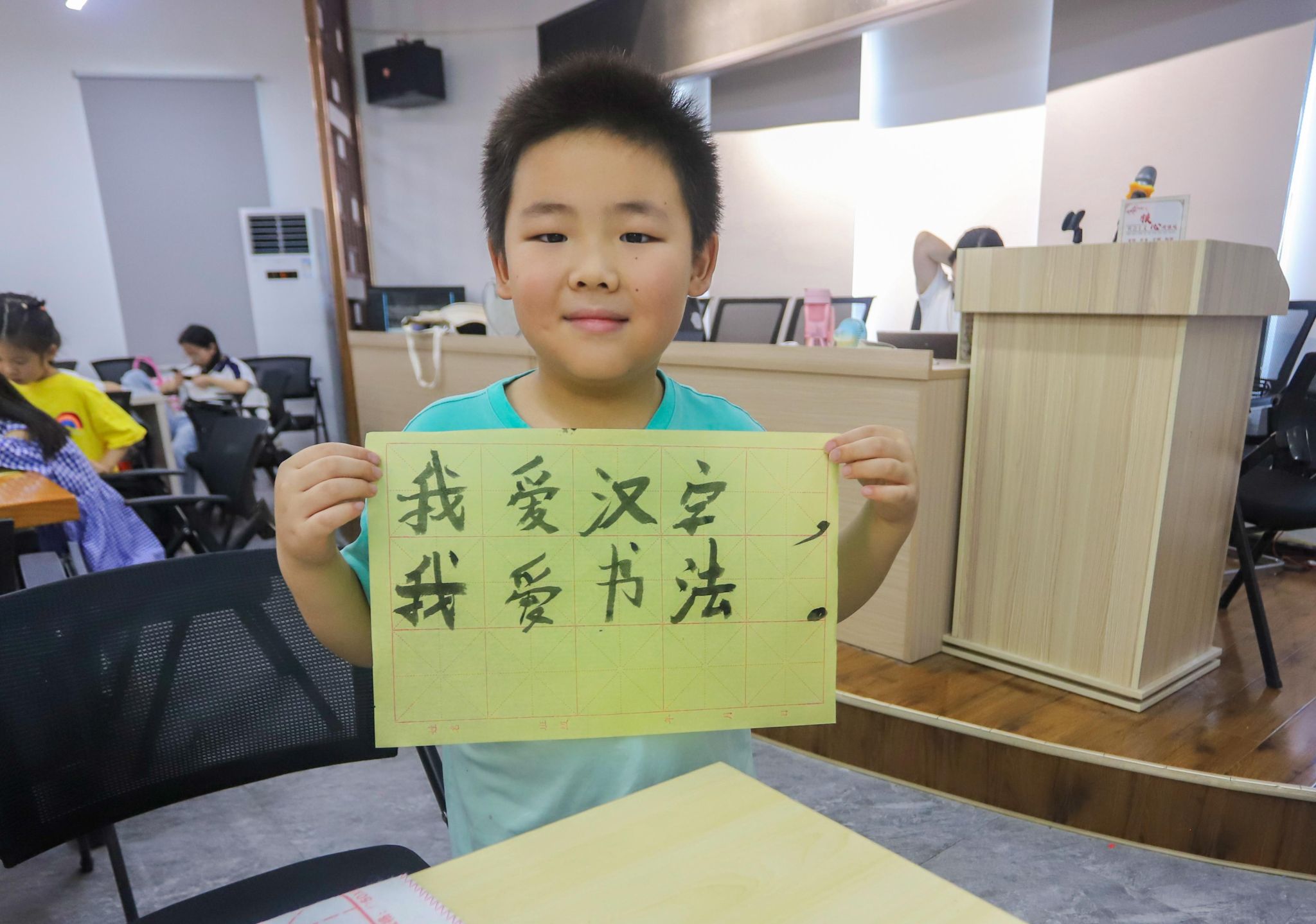 汉沙社区新时代文明实践站活动中心,小男孩笑着展示漆扇成果 王翔宇摄