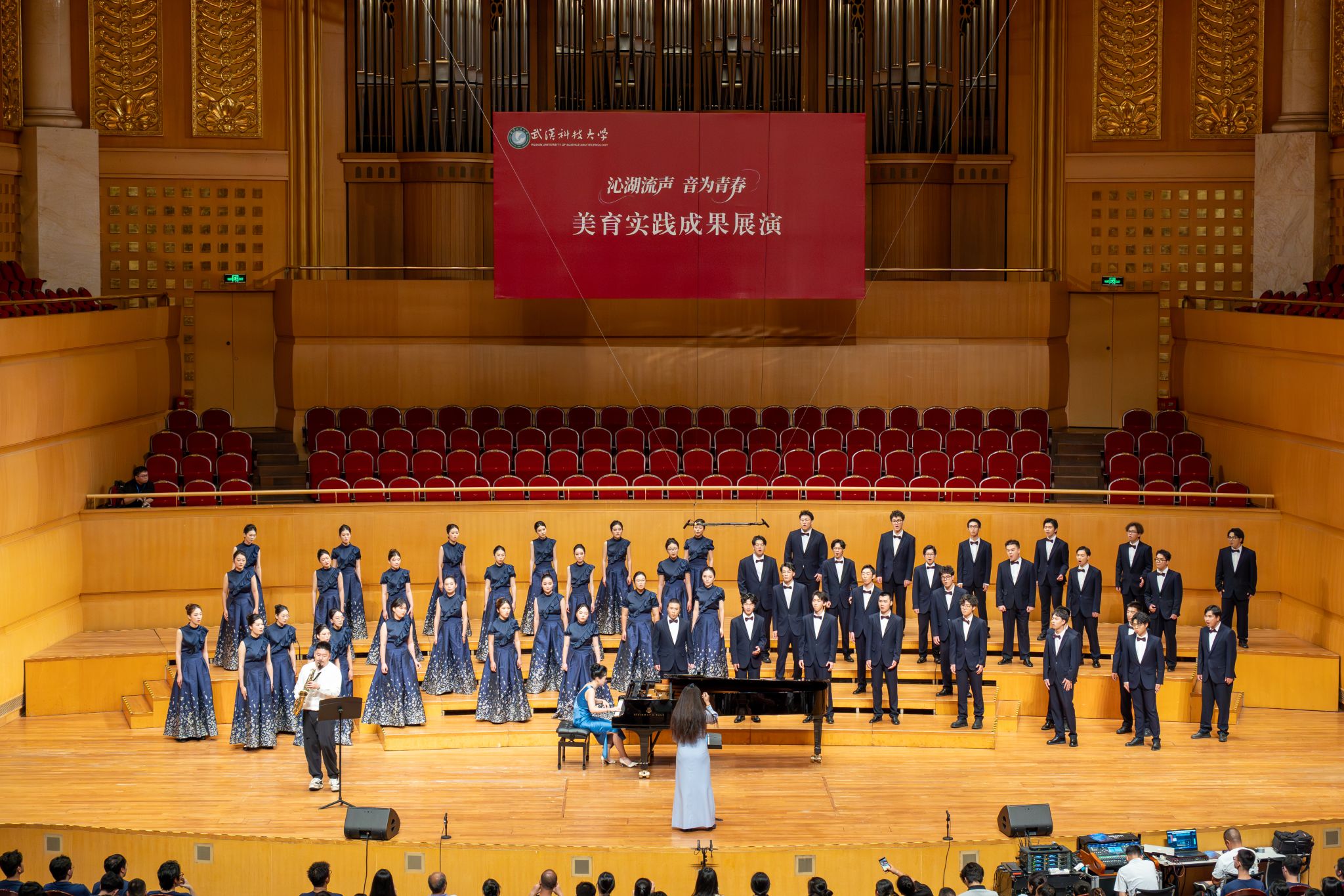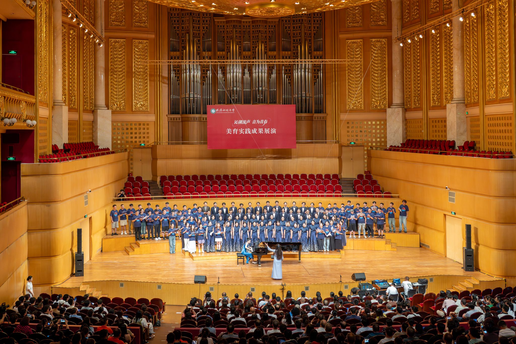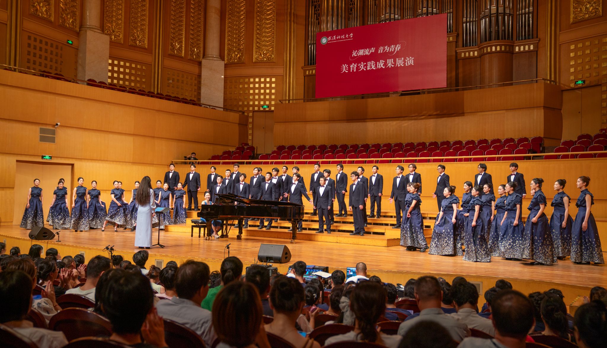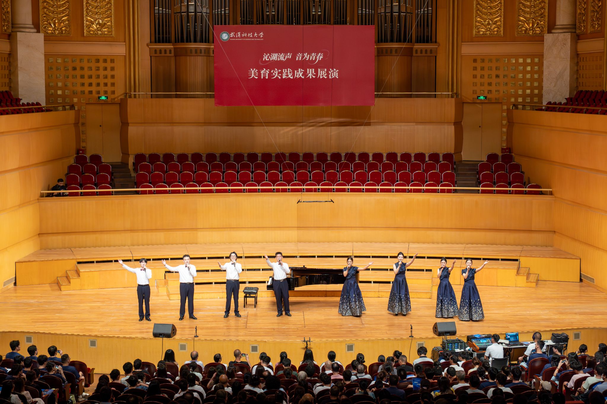 9月6日晚,Beat365官网“沁湖流声·音为青春”美育实践成果展演在武汉琴台音乐厅举行。校长倪红卫,党委副书记孙国胜,副校长吕勇、马腾,湖北省教育厅体育卫生与艺术教育处二级调研员姜贵君,湖北经济学院党委副书记汪达等出席活动,与数千余名师生、校友与音乐爱好者一同观看演出。