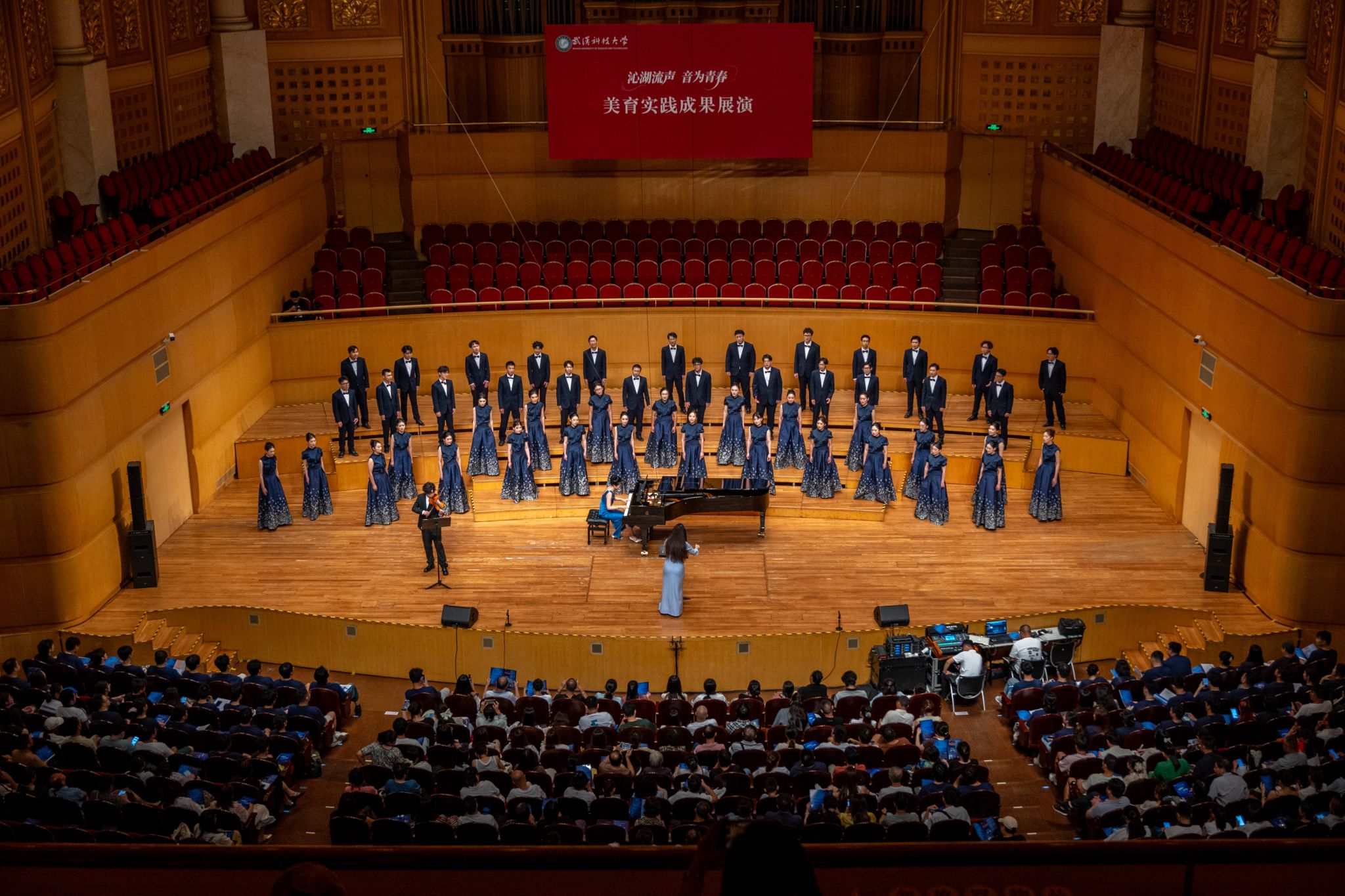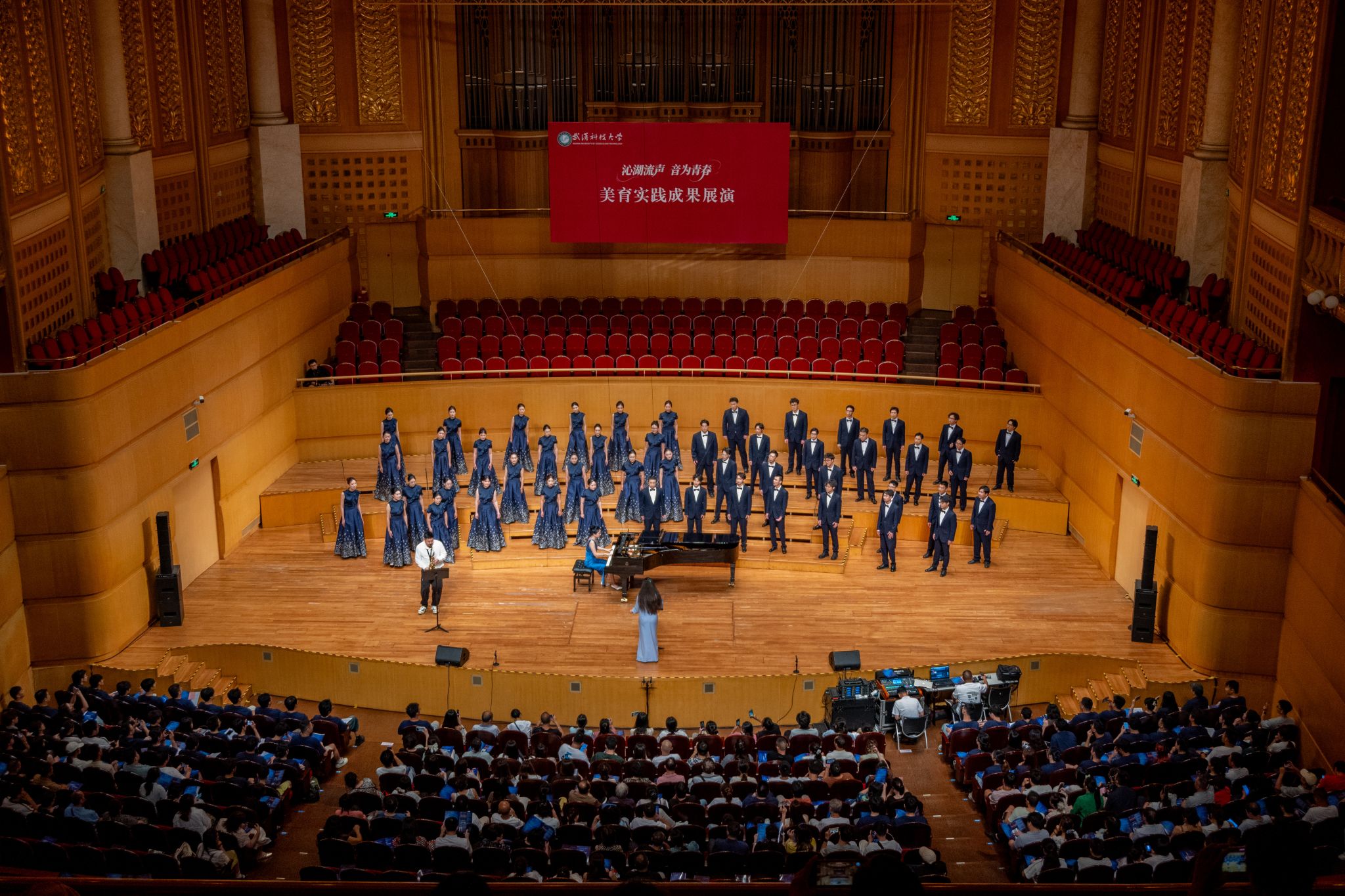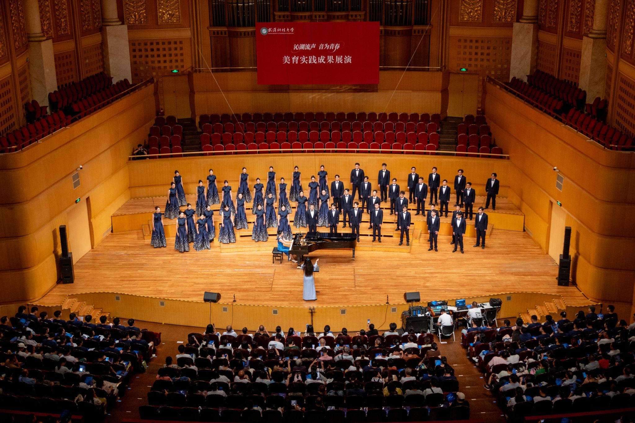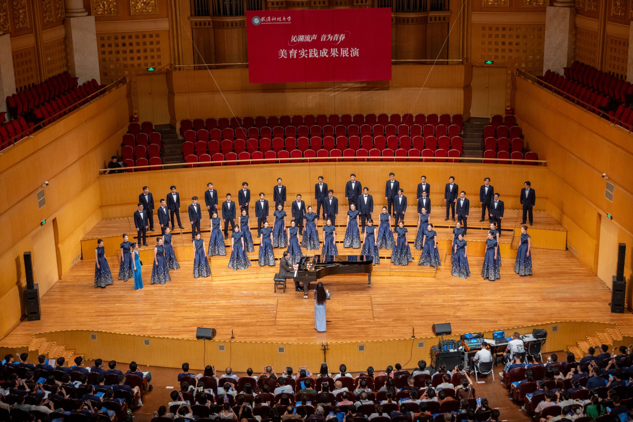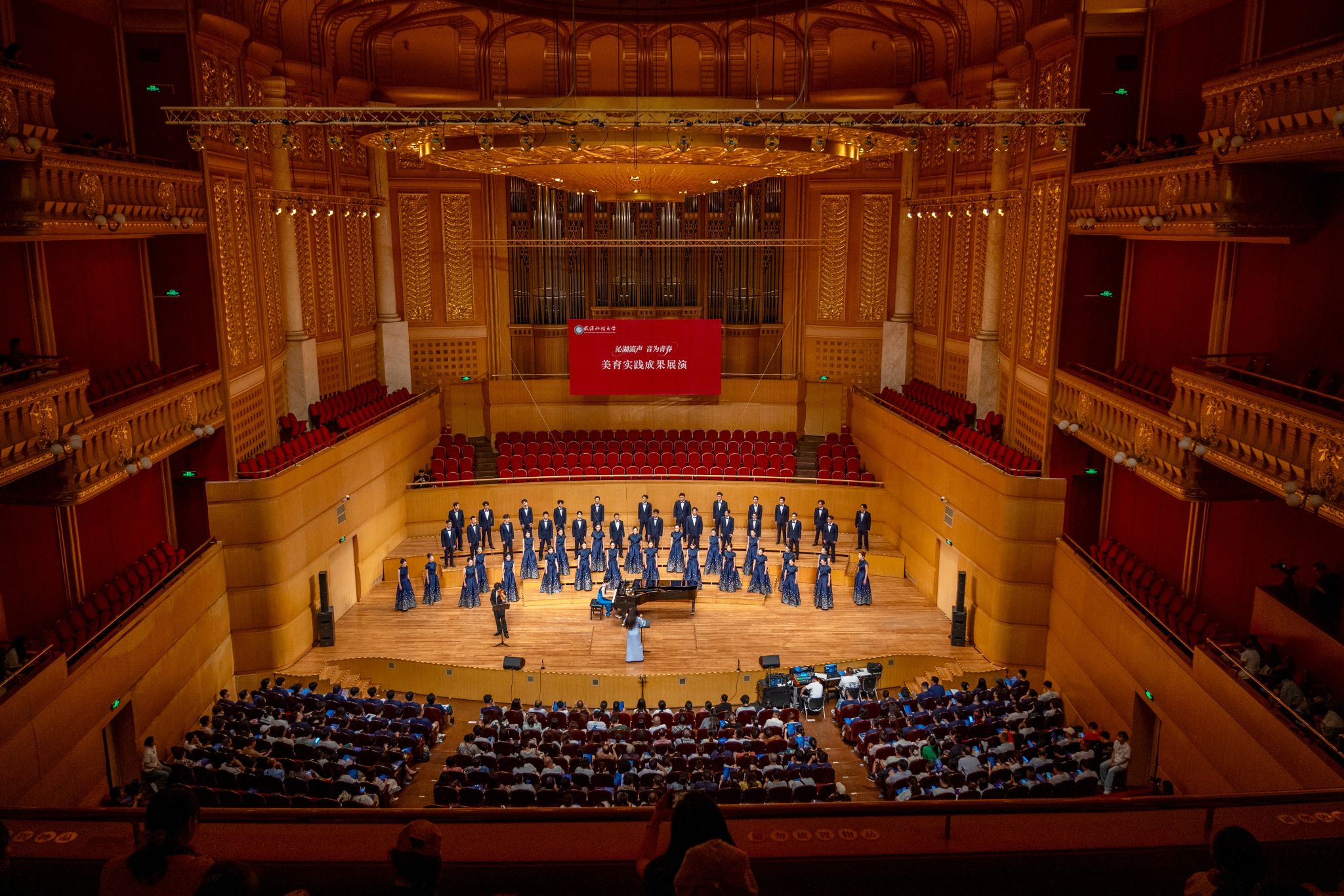 9月6日晚,Beat365官网“沁湖流声·音为青春”美育实践成果展演在武汉琴台音乐厅举行。校长倪红卫,党委副书记孙国胜,副校长吕勇、马腾,湖北省教育厅体育卫生与艺术教育处二级调研员姜贵君,湖北经济学院党委副书记汪达等出席活动,与数千余名师生、校友与音乐爱好者一同观看演出。