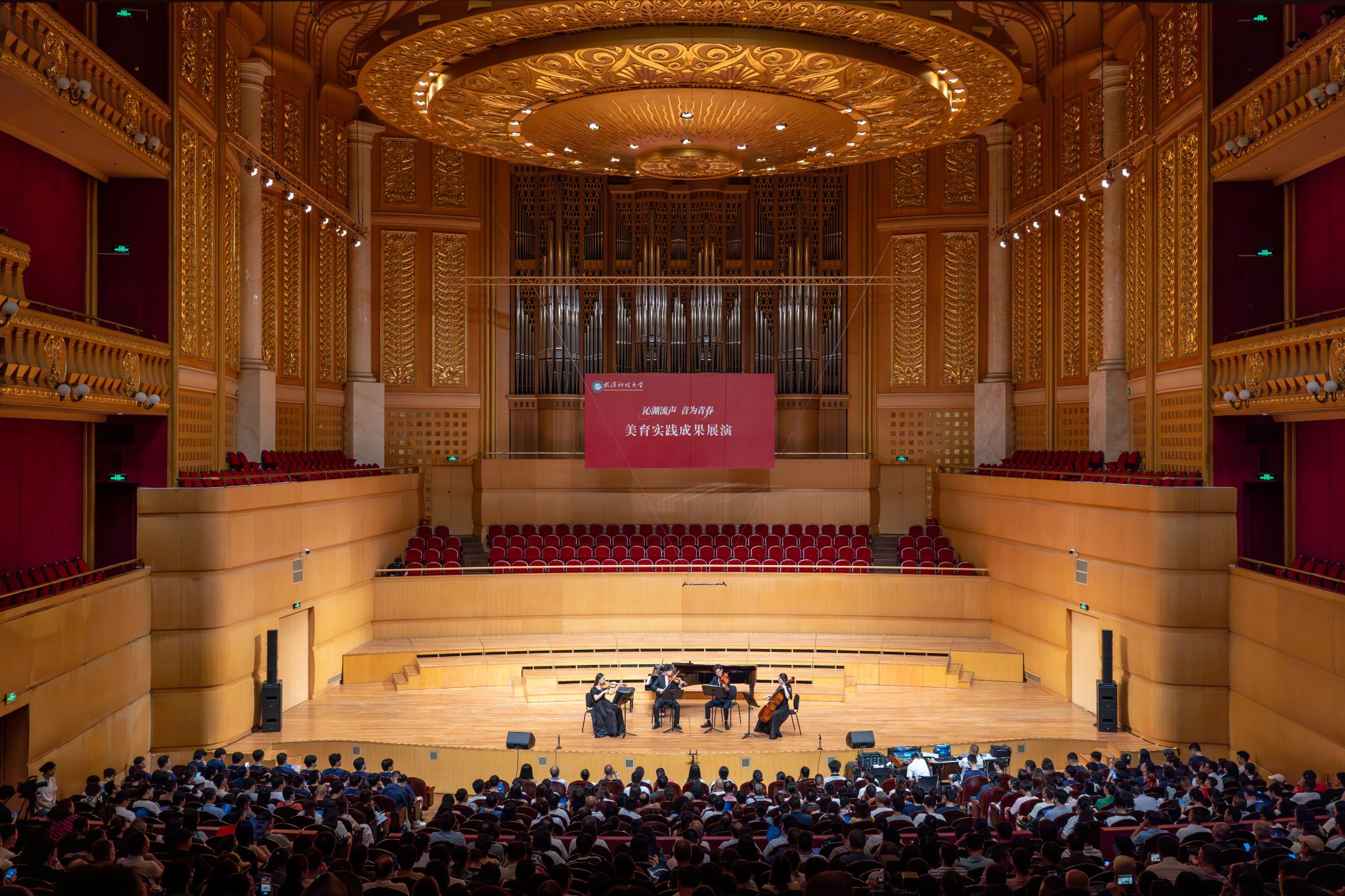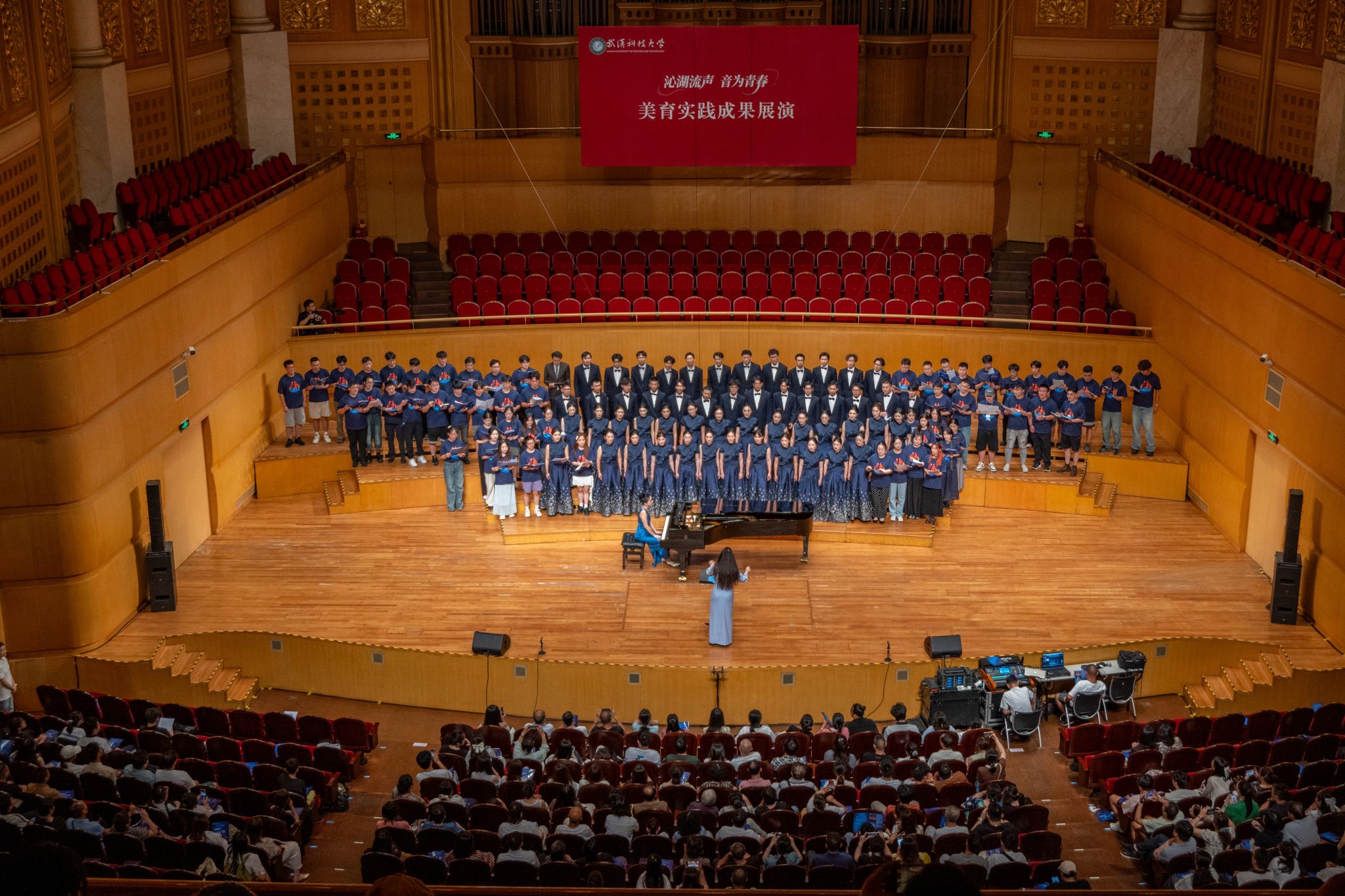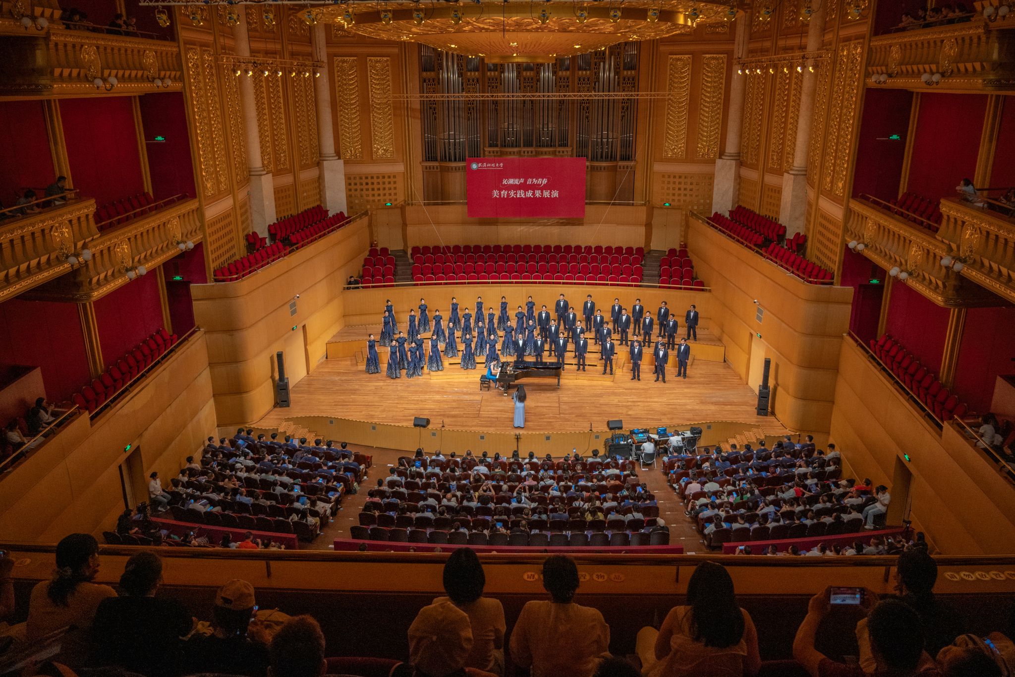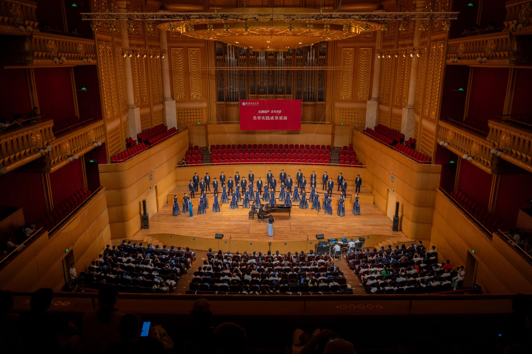 9月6日晚,Beat365官网“沁湖流声·音为青春”美育实践成果展演在武汉琴台音乐厅举行。校长倪红卫,党委副书记孙国胜,副校长吕勇、马腾,湖北省教育厅体育卫生与艺术教育处二级调研员姜贵君,湖北经济学院党委副书记汪达等出席活动,与数千余名师生、校友与音乐爱好者一同观看演出。