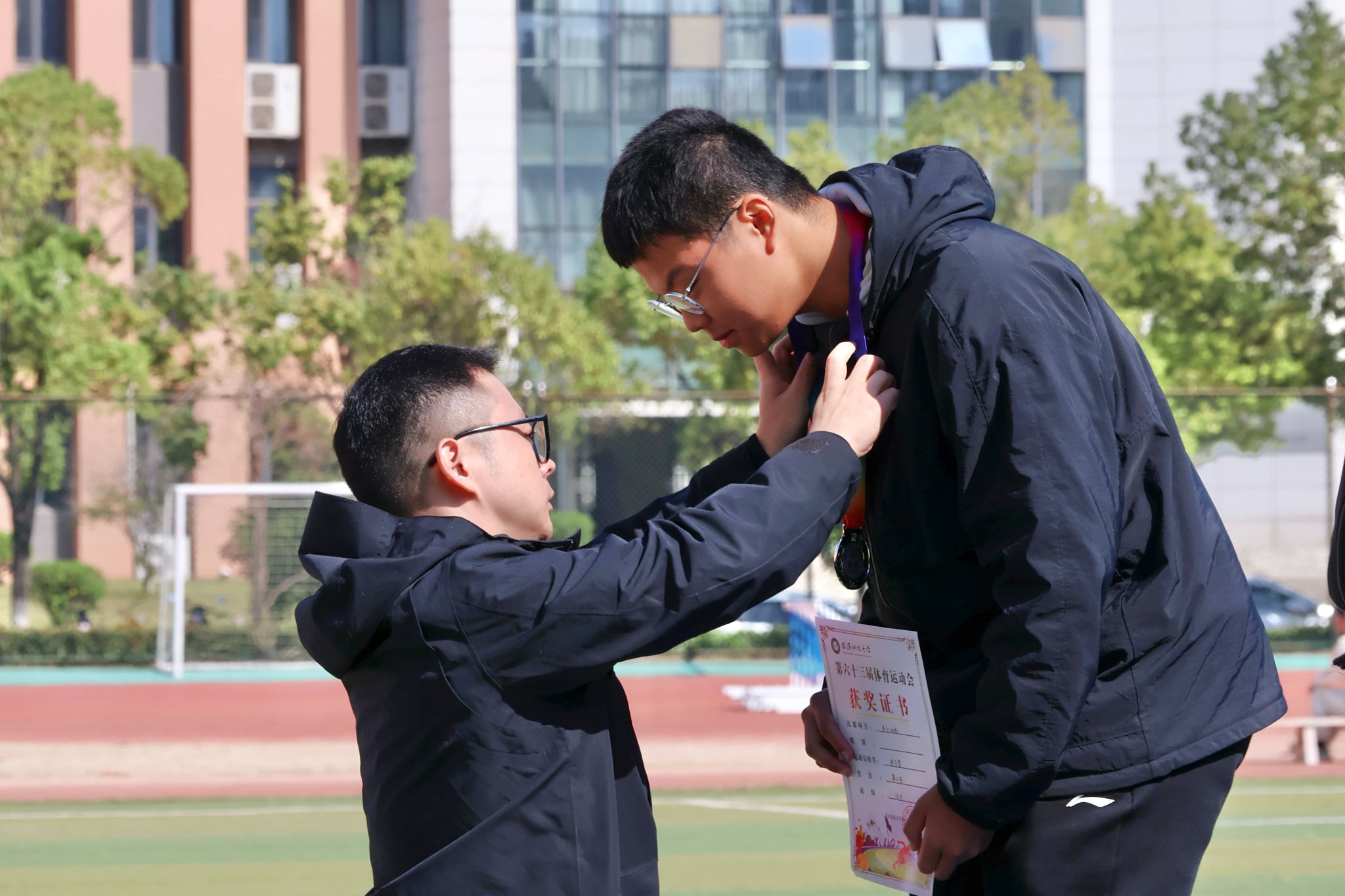 党委研究生工作部副部长毛宝盛给学生带奖牌 卓凌晞摄