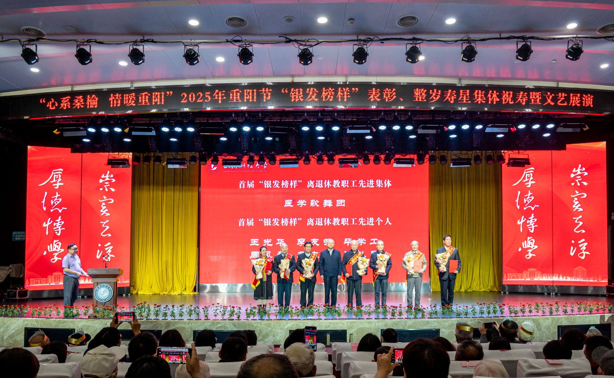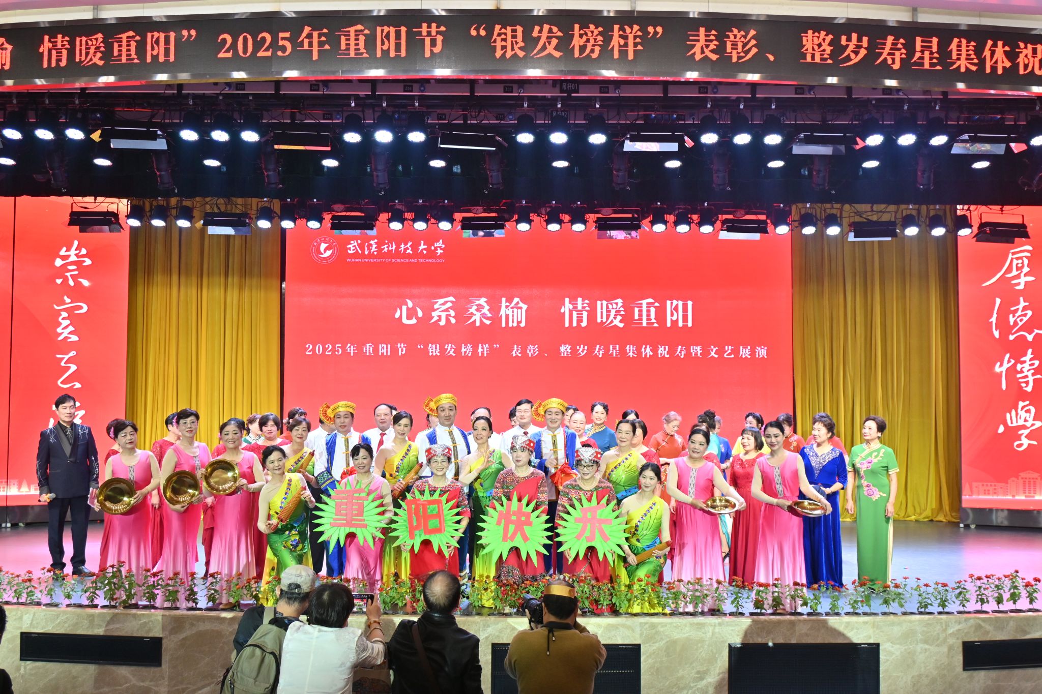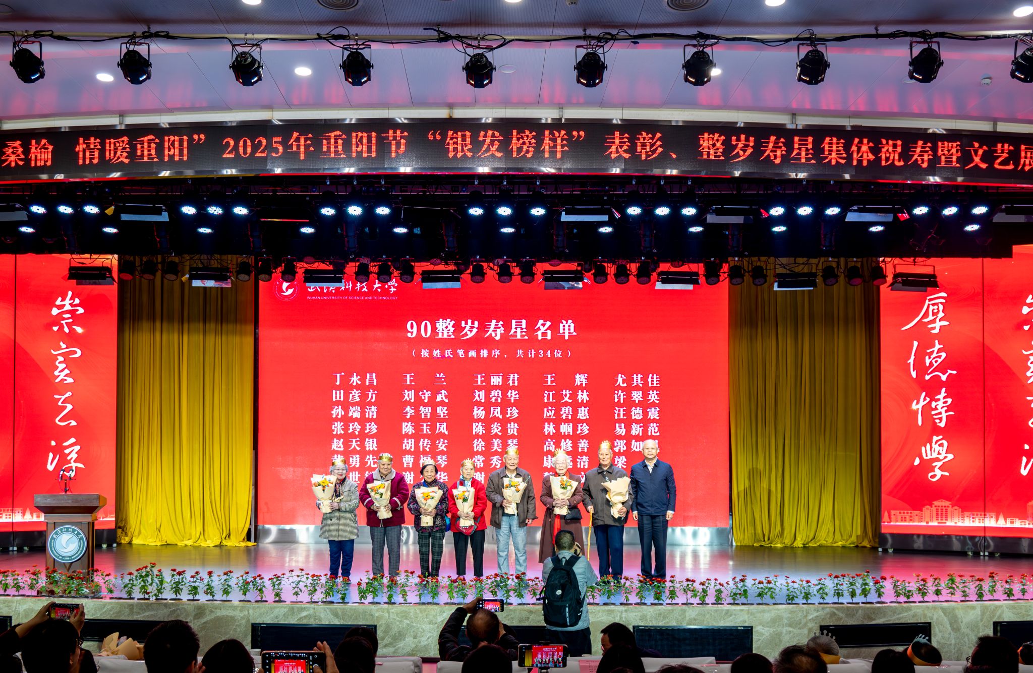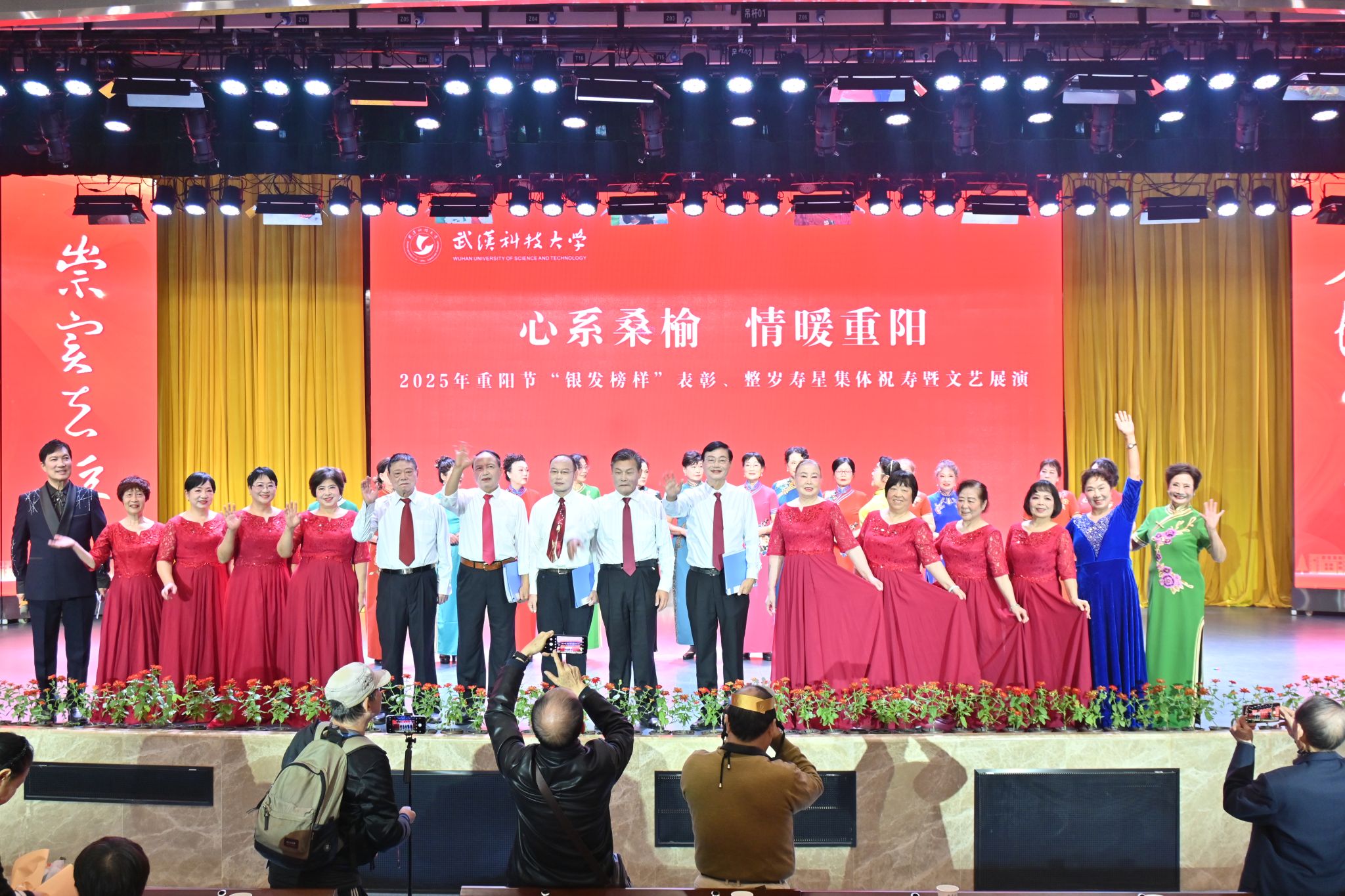 10月28日上午,学校在青山校区碧园会堂举行“银发榜样”表彰仪式暨重阳节集体祝寿活动,现场表彰首届“银发榜样”离退休教职工先进集体、个人,校领导为整岁寿星祝寿。文艺展演环节,京剧表演、湖北小板、时装秀等表演丰富多样、精彩纷呈。