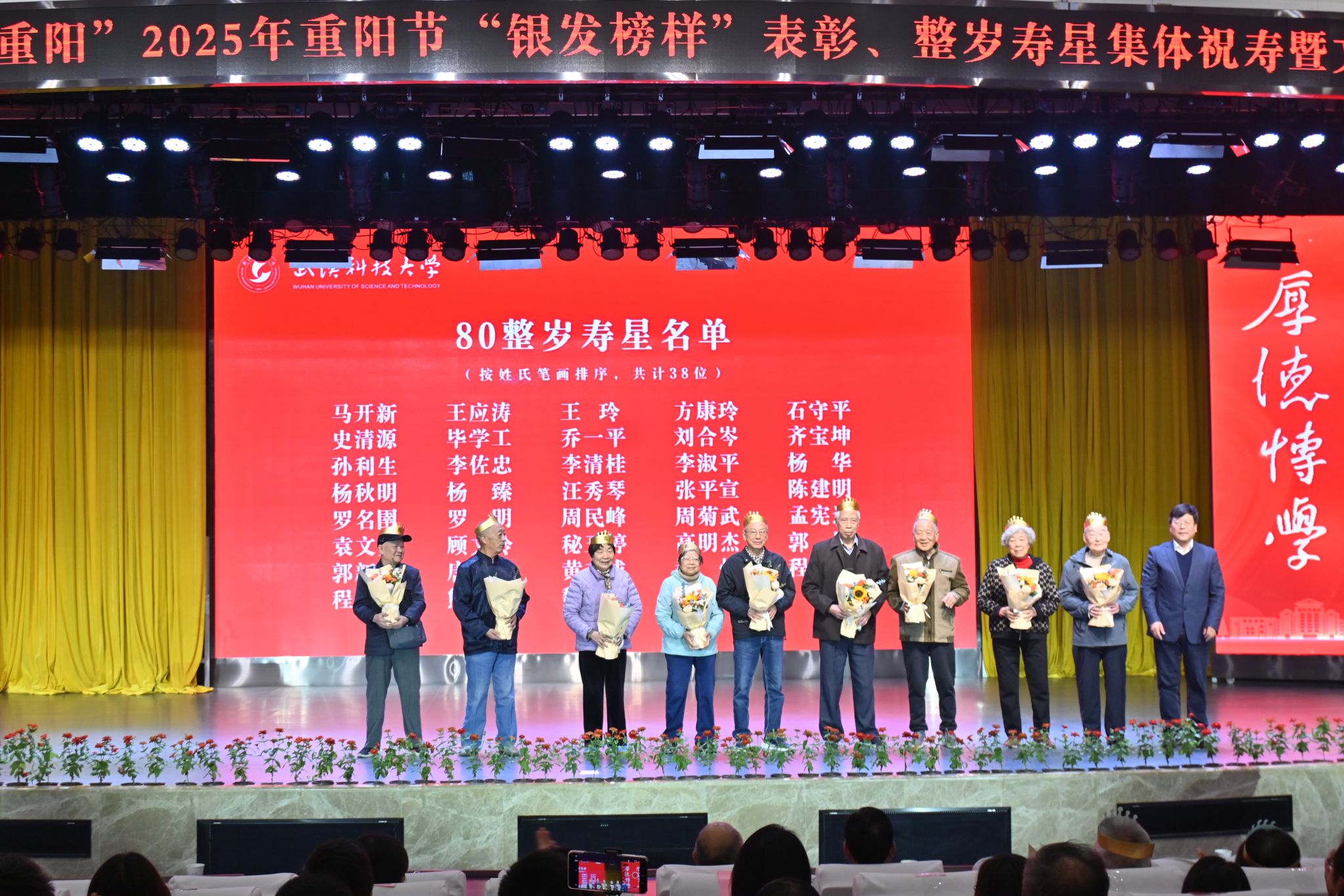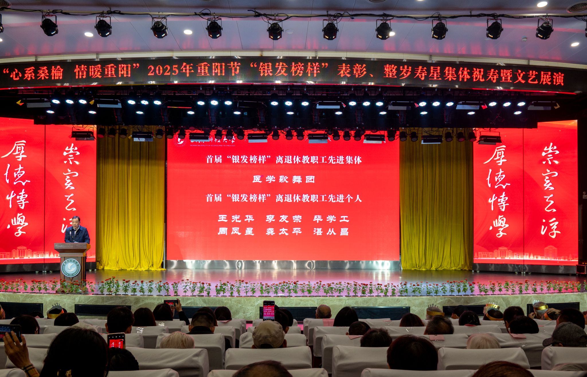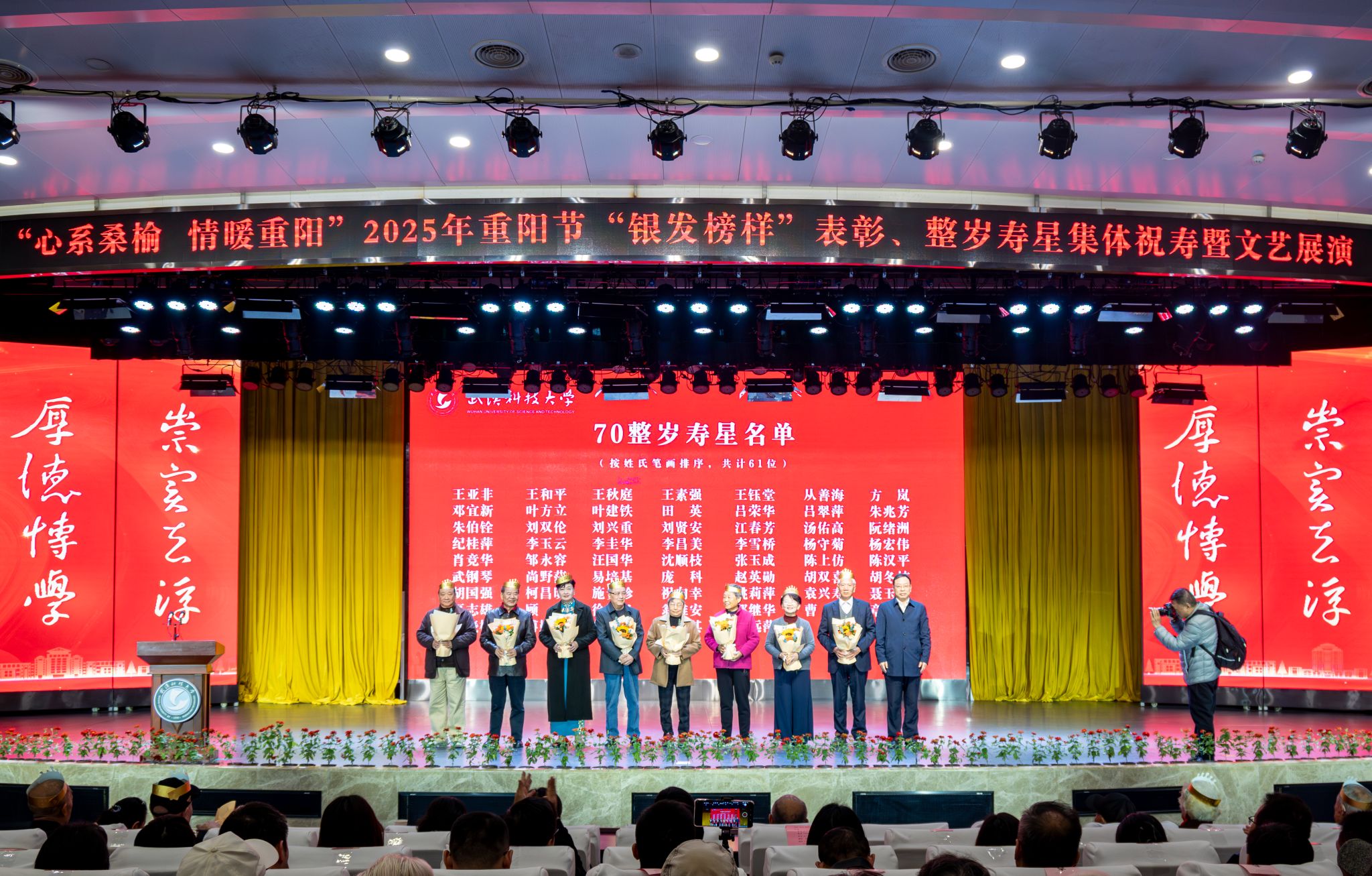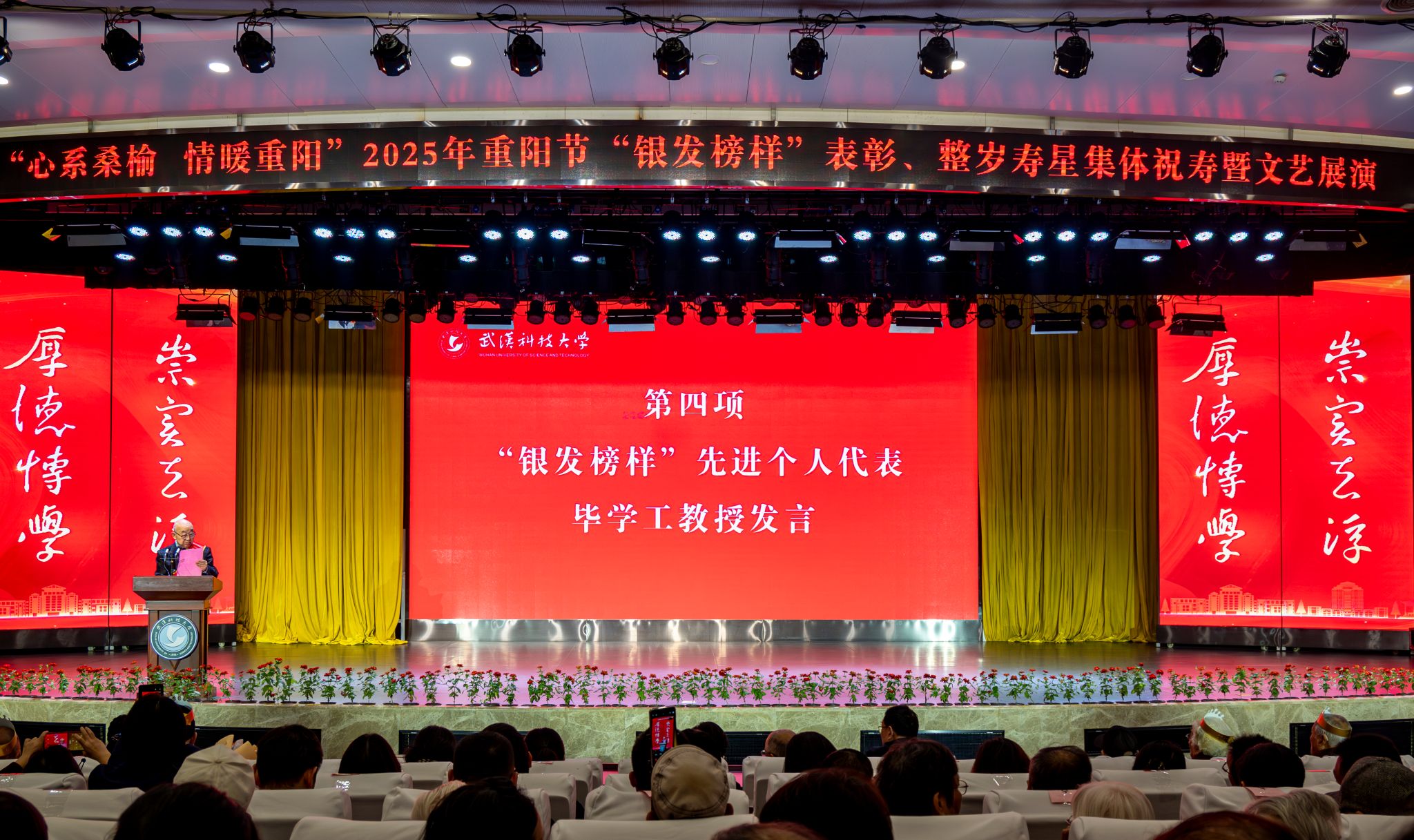 10月28日上午,学校在青山校区碧园会堂举行“银发榜样”表彰仪式暨重阳节集体祝寿活动,现场表彰首届“银发榜样”离退休教职工先进集体、个人,校领导为整岁寿星祝寿。文艺展演环节,京剧表演、湖北小板、时装秀等表演丰富多样、精彩纷呈。