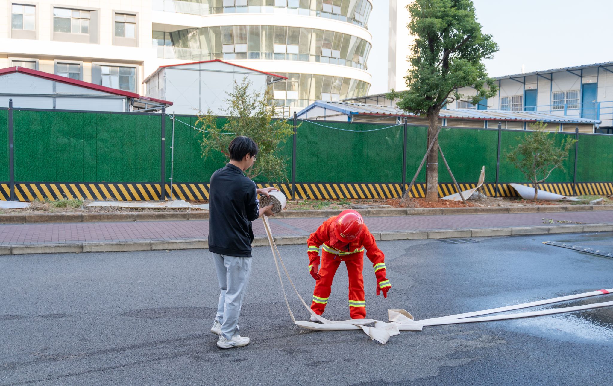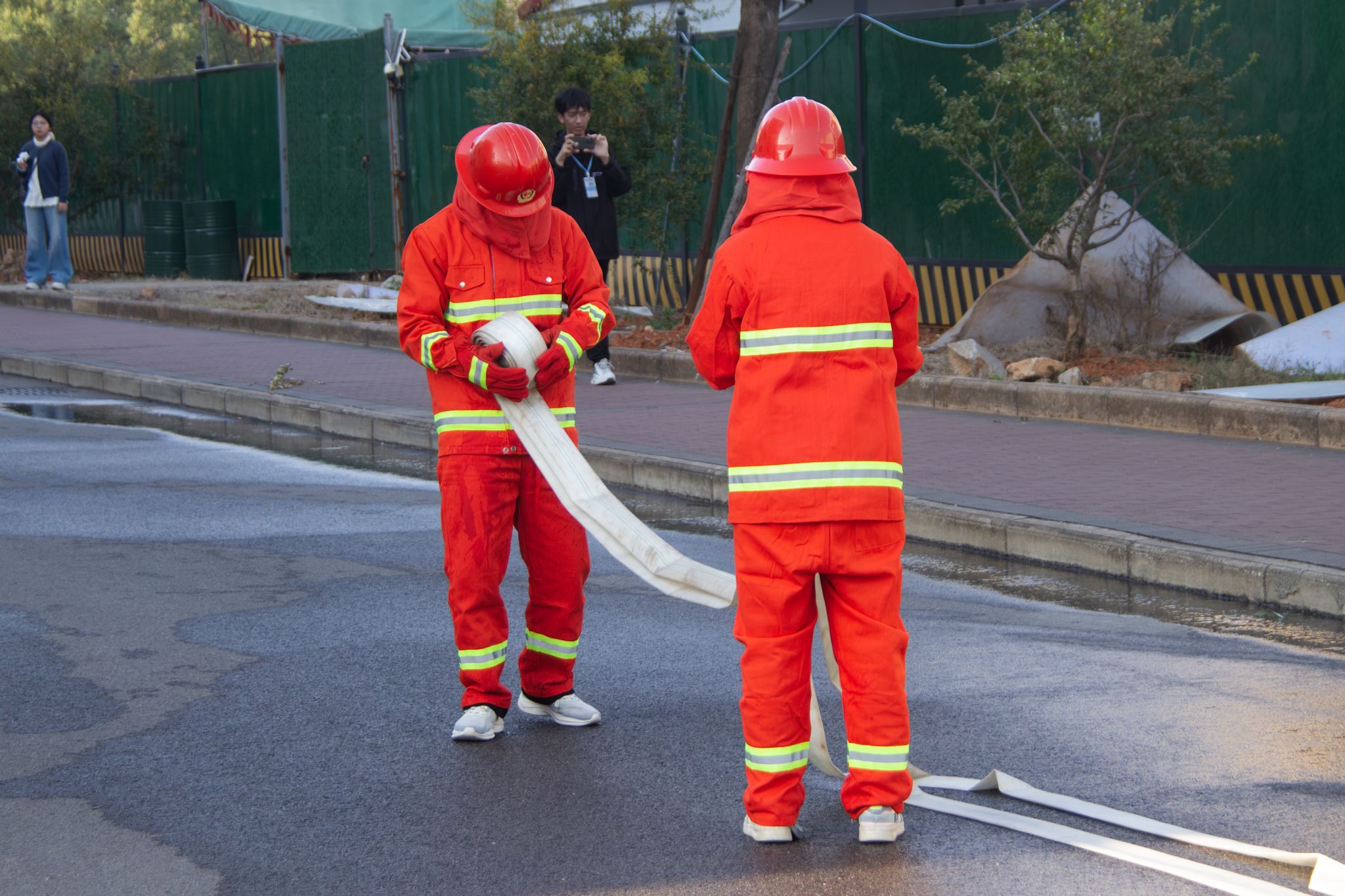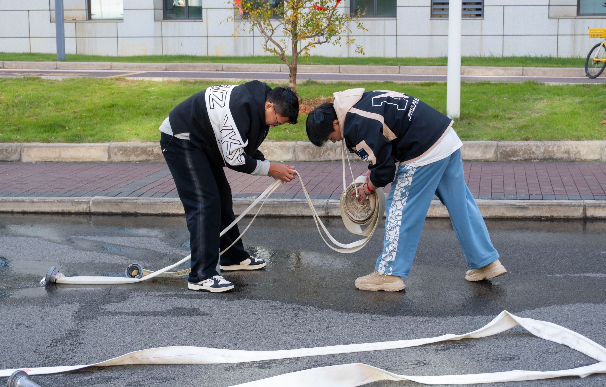 两人组默契收回消防水带 许雯雯摄