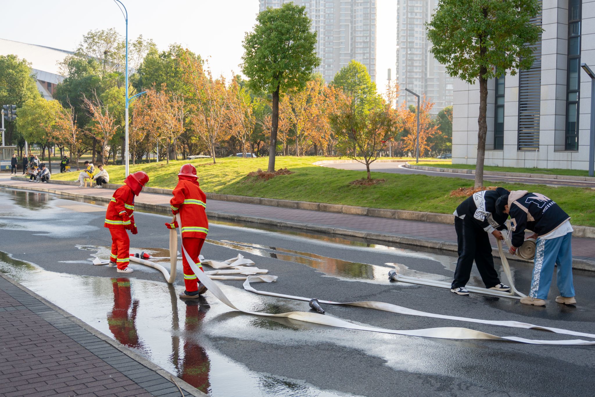 合力收回消防水带 两组同步进行 许雯雯摄