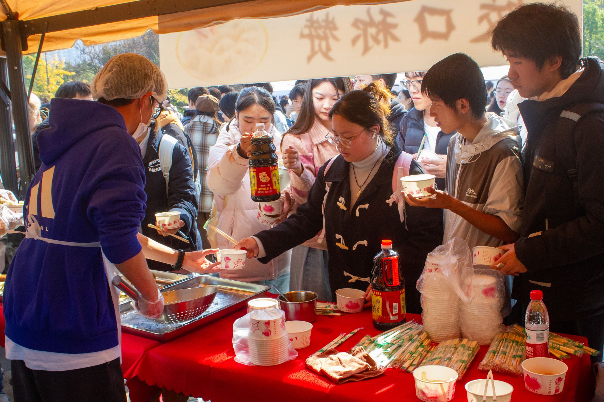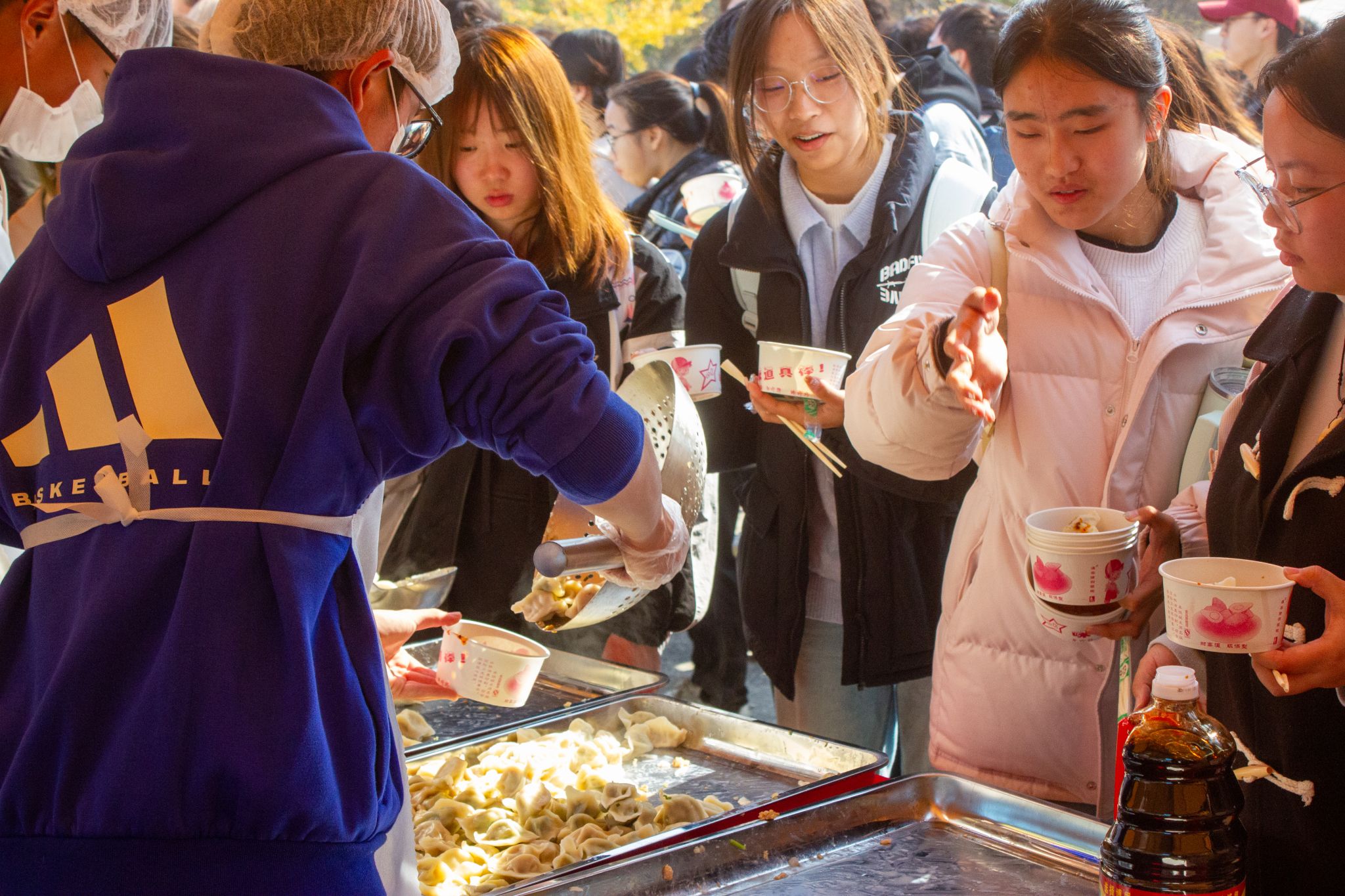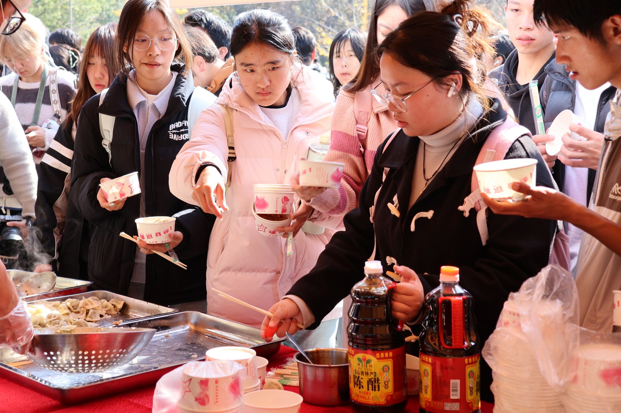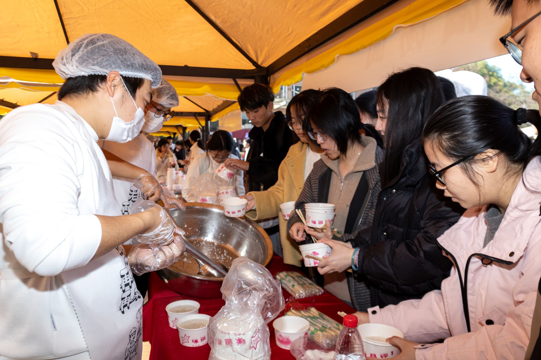 学生领取米酒汤圆 王铭浩摄