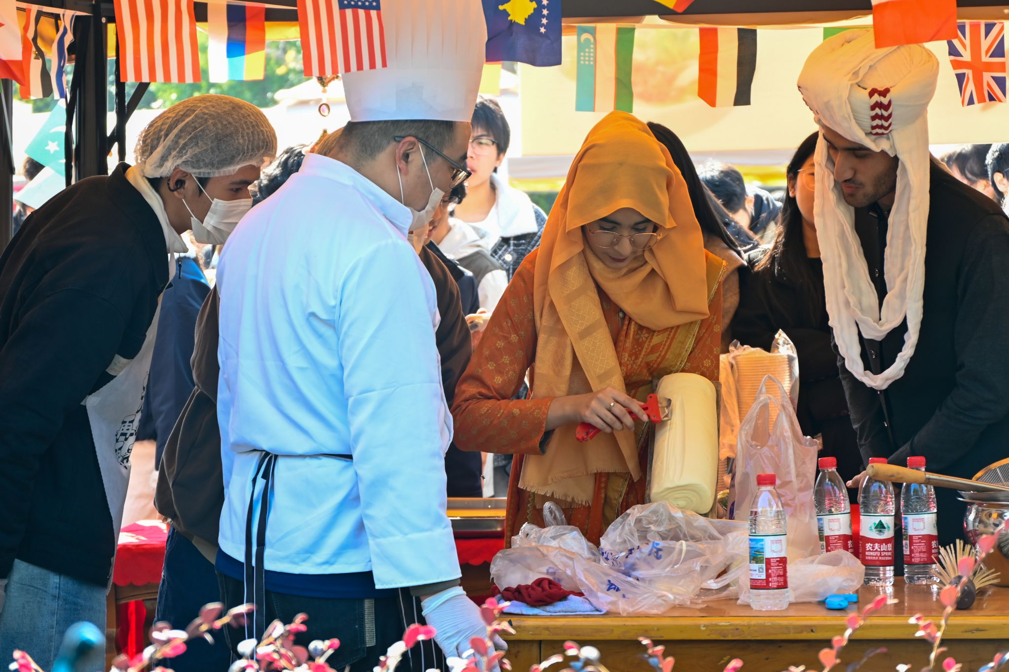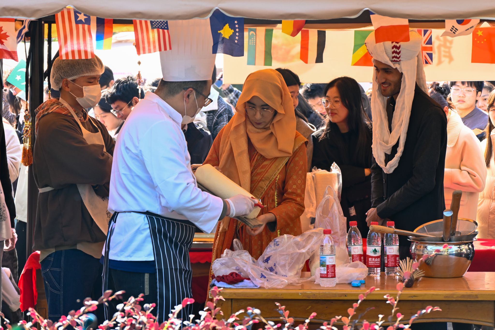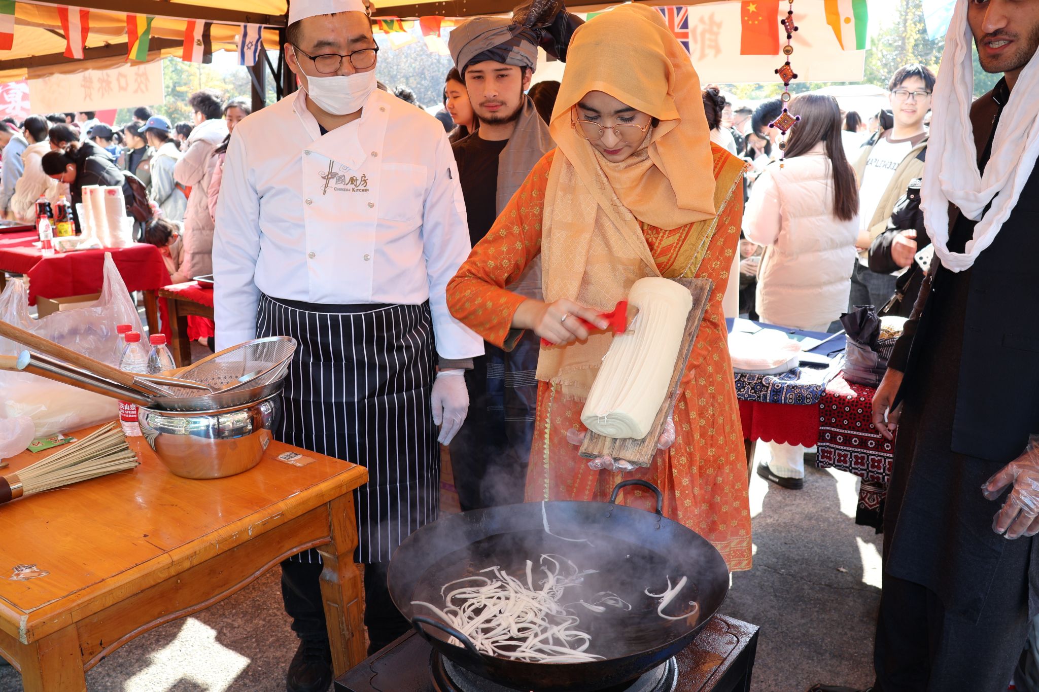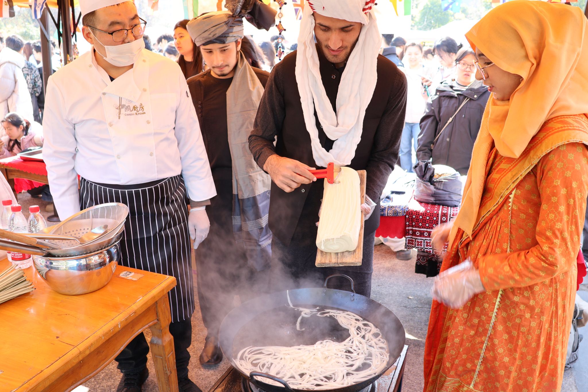 工作人员向留学生掩饰刀削面 胡泰山摄