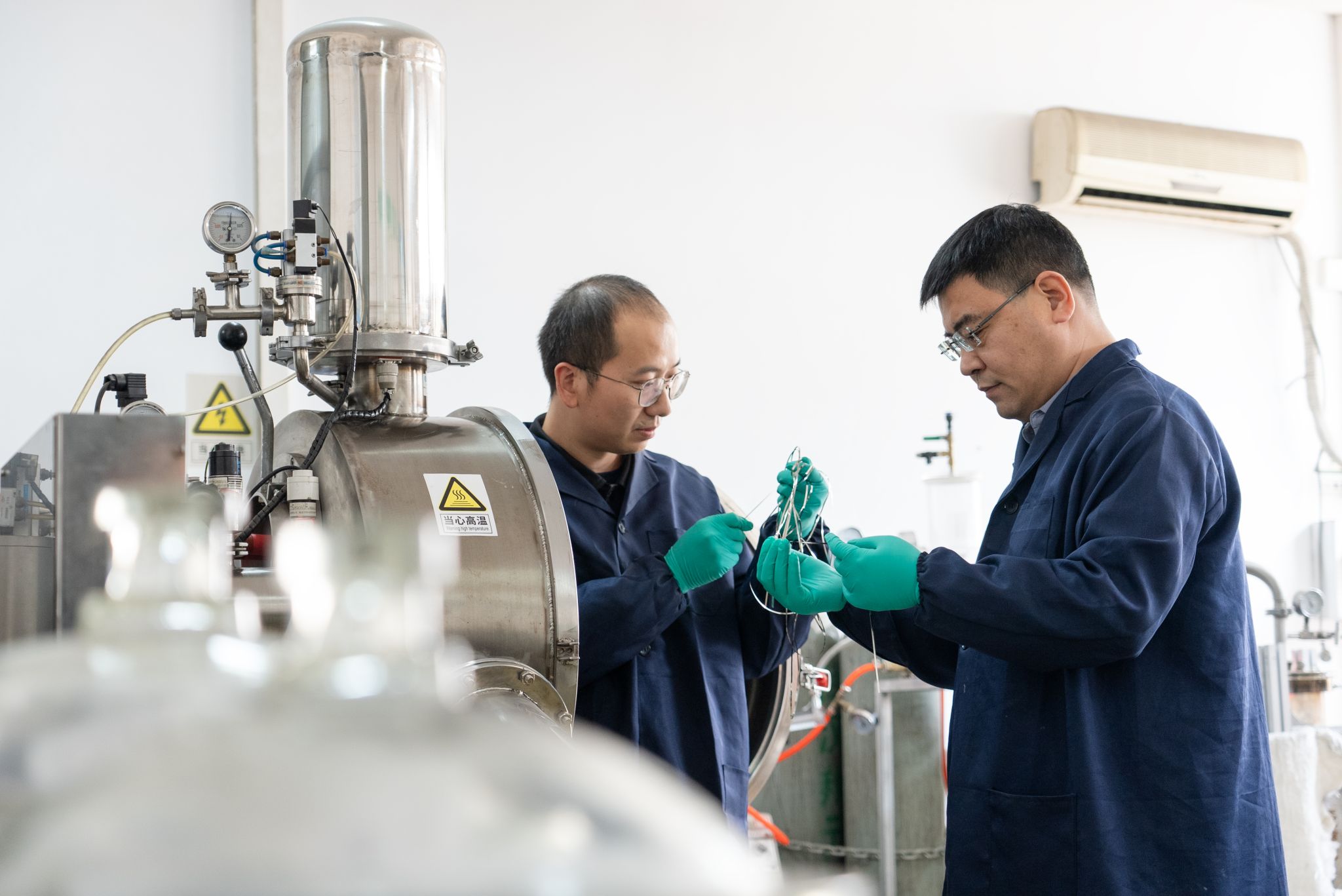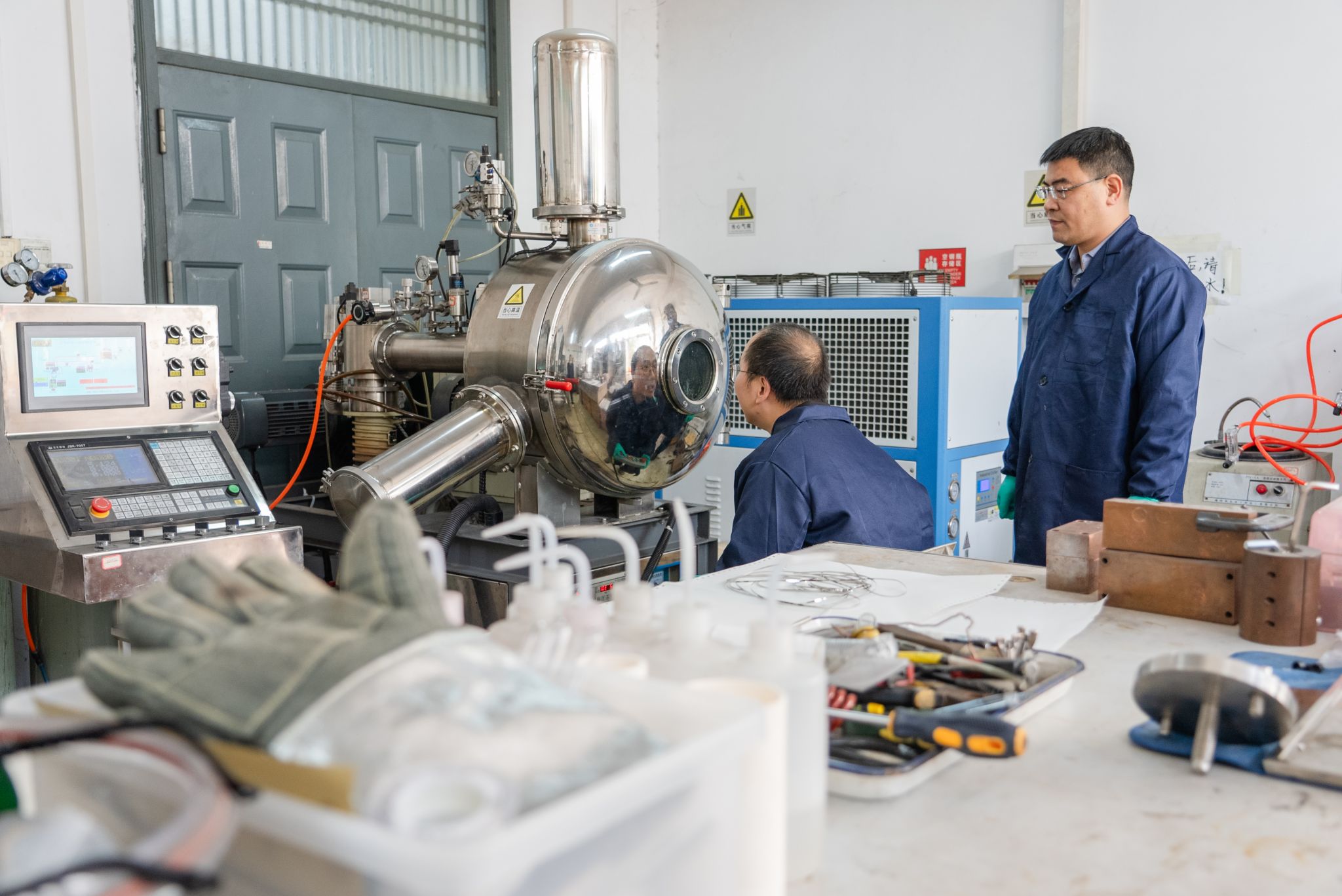 张华教授、刘涛教授在超薄钢设备实验室 毕浩洋摄
