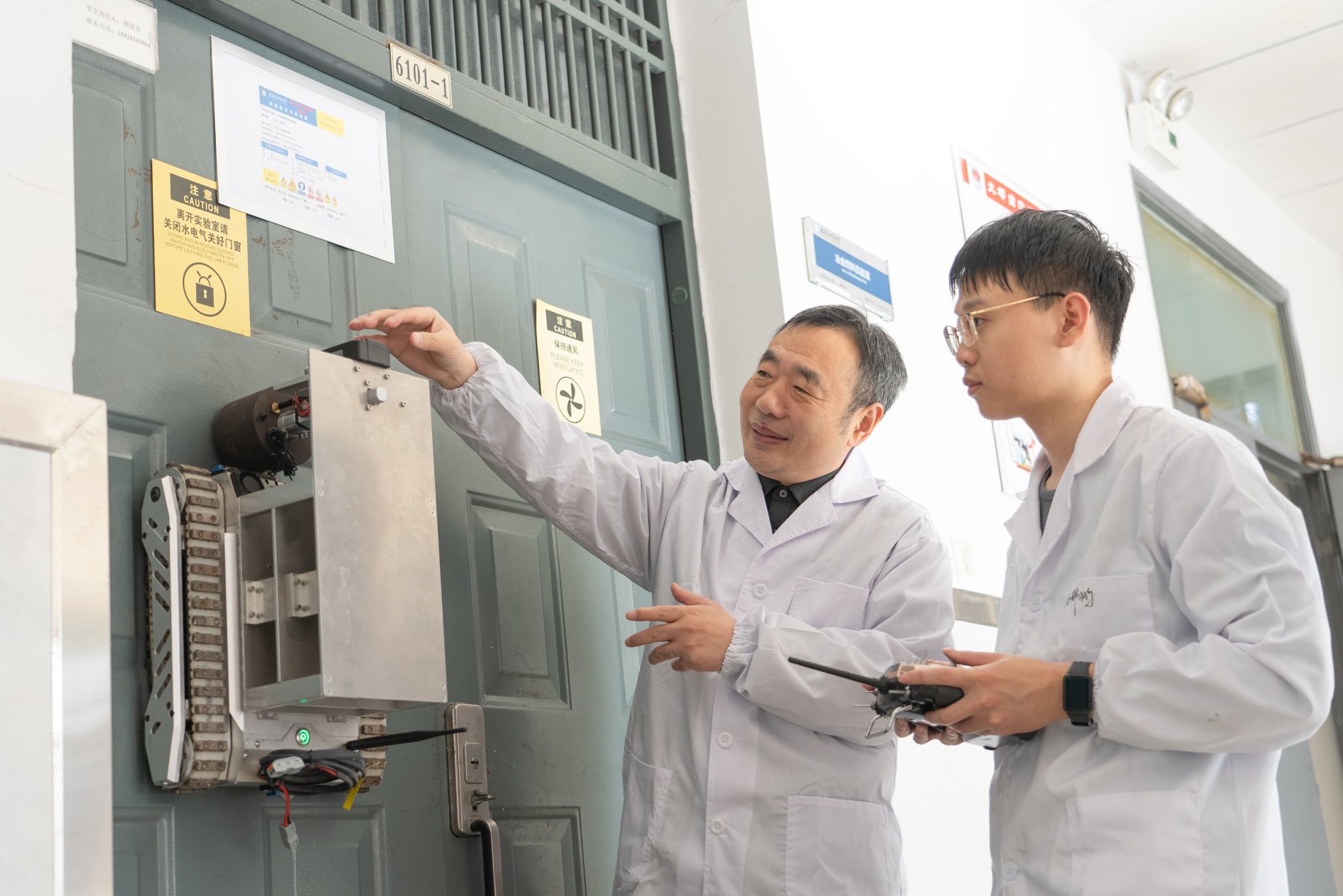 王炜教授及学生操作高炉机器人 毕浩洋摄