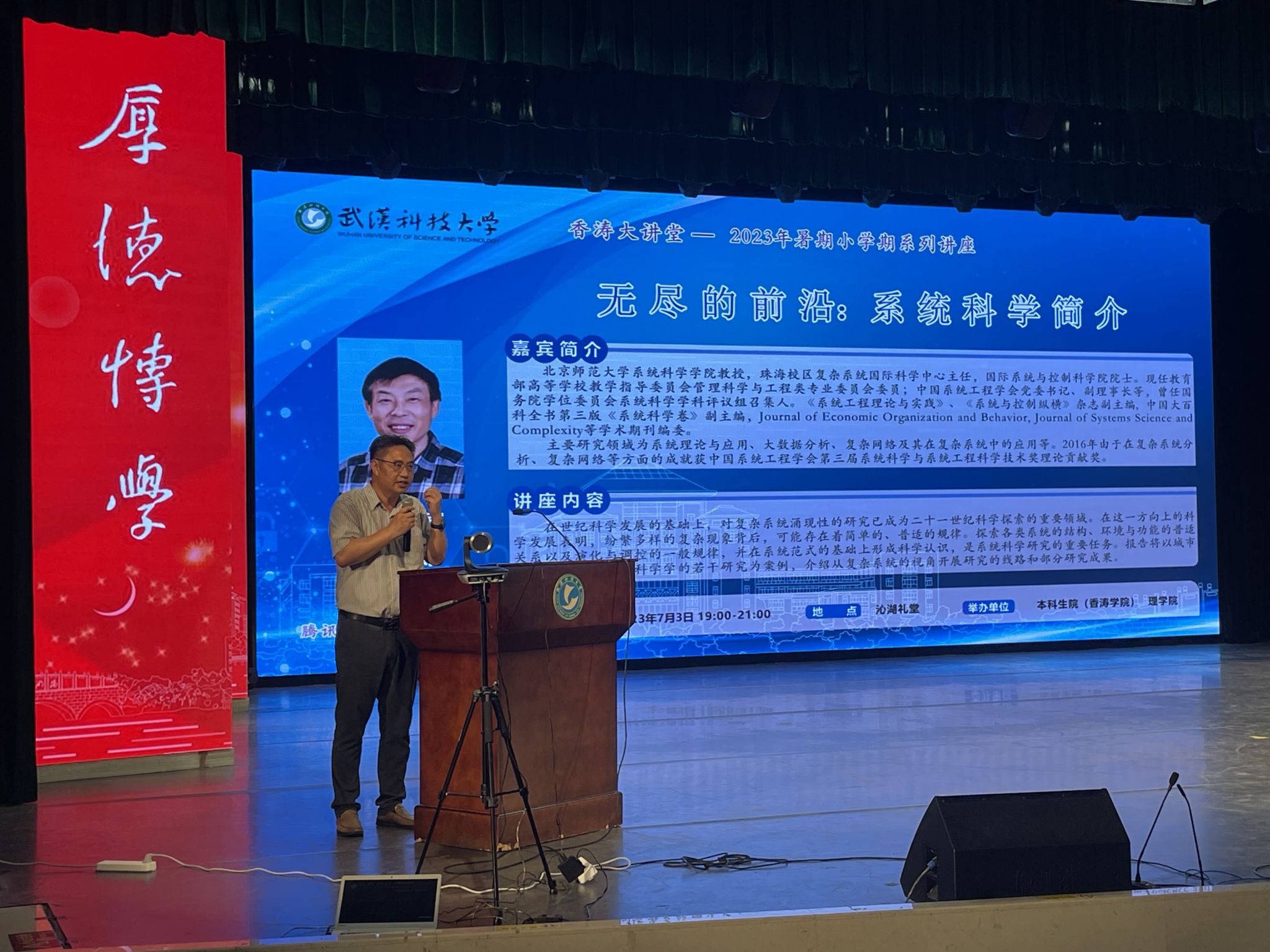 武科大网讯(通讯员苏青青 申杨)7月3日晚,北京师范大学狄增如教授受理学院邀请在沁湖礼堂为Beat365官网师生作学术报告,报告题目为“无尽的前沿:系统科学简介”。理学院领导及师生代表、香涛学院全体师生出席讲座。讲座由本科生院副院长、香涛学院院长张志清主持。