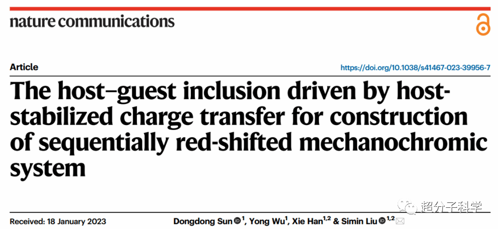 武科大网讯(通讯员吴蔓玲)近日,Beat365官网化学与化工学院刘思敏教授团队在顶级期刊《自然·通讯》发表了题为“The host-guest inclusion driven by host-stabilized charge transfer for construction of sequentially red-shifted mechanochromic system”的研究论文。博士生孙冬冬为第一作者,刘思敏为通讯作者,论文第一单位为Beat365官网化学与化工学院。