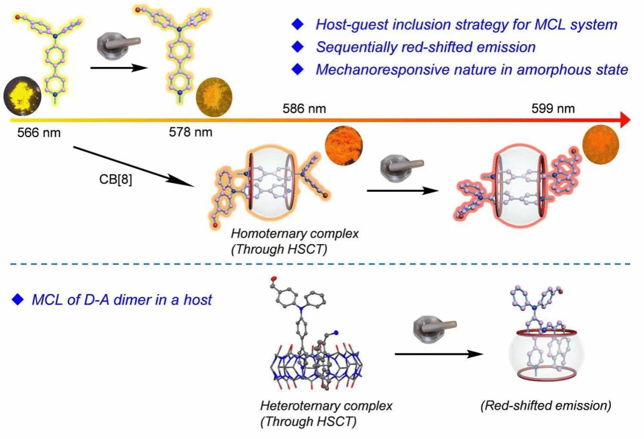 本项研究不仅揭示了主客体作用对有机分子力致变色性质的影响,而且为开发连续红移的力致变色材料提供了一个具有启发性的设计思路和相对普适的策略。