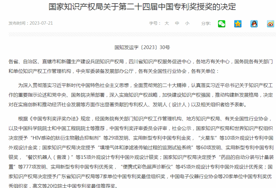 中国专利奖是由国家知识产权局和世界知识产权组织共同主办并对授权专利给予奖励的政府部门奖,每年评审一次。设立中国专利奖旨在鼓励和表彰为科技创新及社会经济发展做出突出贡献的专利权人和发明人,强化知识产权创造、保护、运用,激发全社会创新活力,加快建设知识产权强国,推动经济社会高质量发展。