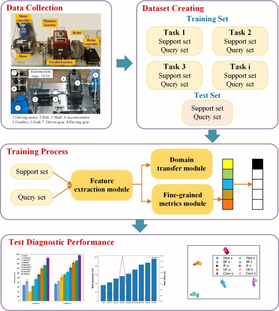 该论文针对现有跨域小样本故障诊断并没有充分考虑训练数据与测试新故障类之间跨域故障分布的差异,提出的联合迁移细粒度度量网络,采用联合传递函数对源域和目标域的相应子域进行对齐,用细粒度度量网络解决固定度量函数的非收缩问题,减轻跨域小样本诊断的负迁移现象,在多个机械设备公共数据集上得到了更高的诊断精度和更好的泛化性,速度满足对设备大规模监测数据进行快速诊断的需要。