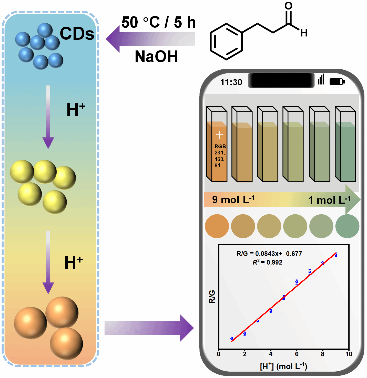 传统pH传感器难以适用于极强酸环境,开发极端酸度传感器具有重要意义。该工作以3-苯丙醛为前体,在常压、50 ℃条件下通过简单搅拌,实现了碳点的克级制备。基于此碳点设计出比例荧光探针,在极酸性条件下可精确检测氢离子浓度,其线性范围广、准确性高。进而采用智能手机,构建可视化、便携检测平台。该研究大大简化了碳点的制备流程,降低了能耗与成本,为碳点的合成开辟了新思路,所构建的极端酸度传感器丰富了碳点的应用场景,这将有效推动碳点的产业化应用。