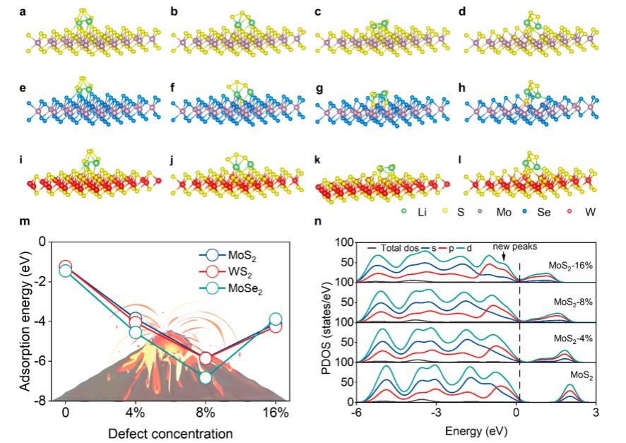 研究亮点二:在锂硫电池催化反应中,缺陷的存在对提高硫电化学转换反应的效率至关重要,但其含量对催化反应的影响机制仍不明确。基于此,先进材料研究团队与澳门大学的邵怀宇教授等合作,以缺陷含量不同的MoS2为原料,研究了其中缺陷浓度与吸附催化性能之间的定量关系,通过密度泛函理论计算和原位拉曼表征阐明了含有硫空位的MoS2-x对多硫化物的催化转化机理,发现硫缺陷的增加可以显著改变MoS2-x的电子结构和几何结构,合适的硫缺陷浓度能有效提高MoS2-x与LiPSs的结合能,降低LiPSs转化反应的能垒,促进Li2S双向催化反应的动力学过程。研究论文 “Elucidating the Volcanic Type Catalytic Behavior in Lithium Sulfur Batteries via Defect Engineering”,在线发表于纳米领域国际顶级期刊ACS Nano上(2022年影响因子17.1,DOI: 10.1021/acsnano.3c05269),耐火材料与冶金国家重点实验室雷文副教授为本文共同通讯作者。