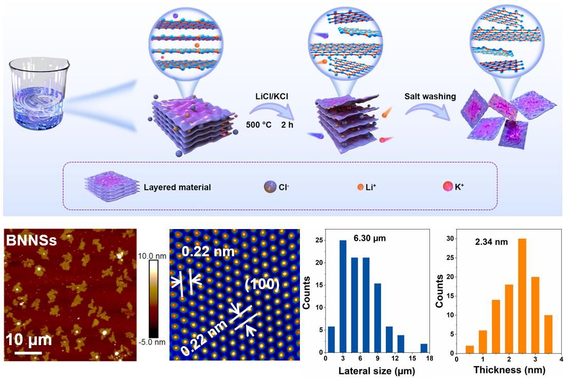 研究亮点一:二维材料具有迁移率高、带隙可调和比表面积大等优点,在电子、光电子、传感器及柔性器件等领域具有广阔的应用前景。制备大尺寸且层数可控的二维材料对规模化高端器件的发展具有重要的科学意义。本团队提出了一种新的熔盐辅助剥离策略,利用熔融盐为液体介质,在高温条件下通过高频扰动产生剪切力,成功实现了氮化硼、石墨烯、MXene、硫化钼和层状黏土等层状材料的高效剥离。所制备的氮化硼纳米片(BNNSs)的纵向长度/高度比可达2692,远高于文献中报道的其它方法;所制备的氮化硼纳米片/石墨烯气凝胶在油水分离方面表现出优异的性能。研究论文“Modified molten salt assisted exfoliation of large-size 2D materials”,在线发表于材料科学领域国际顶级期刊Advanced Function Materials上(2022年影响因子19.0,DOI: 10.1002/adfm.202310371),Beat365官网2021级硕士研究生李梓毓为本文第一作者,耐火材料与冶金国家重点实验室雷文副教授和张海军教授为本文共同通讯作者。