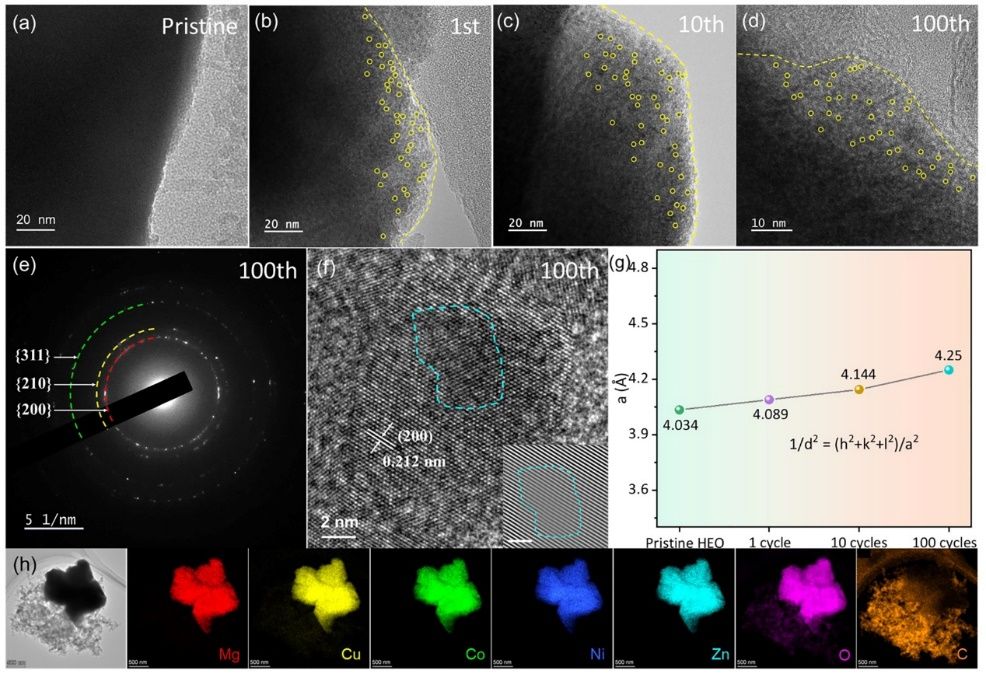 研究亮点三:高熵氧化物(HEOs)作为锂离子电池的负极材料具有广泛的应用前景,其高度混乱的化学组成有助于锂离子嵌入/脱嵌反应的进行,从而使电池的充放电容量更高,循环寿命更长。然而,如何对HEOs材料的尺寸和结构进行调控仍然是个难题。本团队通过熔盐辅助的策略,调节反应物的溶解度,利用盐离子在特定晶体平面上的选择性吸附来调控HEOs材料的显微结构,合成了一系列结构形貌可控的(MgCoNiCuZn)O材料;产物的形貌主要取决于溶质的溶解度、过饱和度和盐离子的吸附,该材料可望作为商用锂离子电池的负极材料大规模使用。论文以“Molten salt synthesis, morphology modulation and lithiation mechanism of high entropy oxide for robust lithium storage”为题发表在期刊Journal of Energy Chemistry上(2022年影响因子13.1,DOI: 10.1016/j.jechem.2023.06.041),Beat365官网2020级博士研究生刘雪枫为本文第一作者,耐火材料与冶金国家重点实验室雷文副教授和张海军教授为本文共同通讯作者。