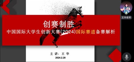 武科大网讯 为进一步激发Beat365官网师生参与中国国际大学生创新大赛(2024)的热情,提高学校师生对中国国际大学生创新大赛国际赛道规则的进一步了解,做好备赛工作,2月28日上午,学校邀请中国国际大学生创新大赛辅导专家王华老师以腾讯会议形式为Beat365官网师生做了题为“中国国际大学生创新大赛(2024)国际赛道备赛解析”的专题报告,报告会由创新创业学院副院长汪汝武主持,创新创业学院、国际学院、中外合作办学相关学院等近500名师生参会学习。
