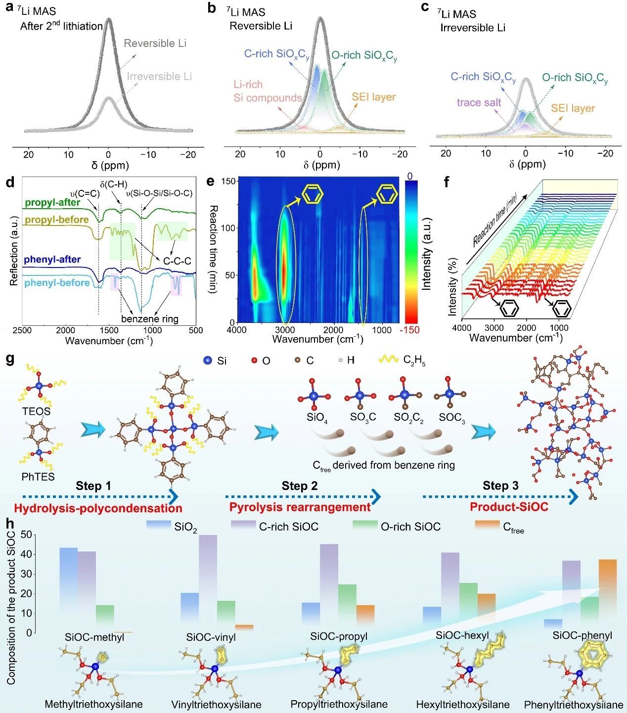 研究亮点二:硅氧碳(SiOC)是一种很有前途的锂离子电池负极材料。然而,SiOC的结构组分对Li+存储行为的影响,特别是自由碳(Cfree)的可控引入及其对电化学性能的影响,仍然是一个需要解决的关键挑战。本团队近期研究发现,R基三乙基氧基硅烷中的R基官能团(仅由碳和氢原子组成)可以通过热分解衍生为SiOC中的Cfree相,以实现在SiOC负极材料中可控引入Cfree 。在此基础上,采用简便、可扩展的聚合物前驱体法制备了具有特定结构组成和Cfree含量的SiOC材料,结合密度泛函理论计算研究了SiOC中Cfree对锂离子存储性能的影响规律,证实较高的Cfree含量可以构建离子/电子快速迁移的“高速公路”,显著增强SiOC负极的Li+动力学。