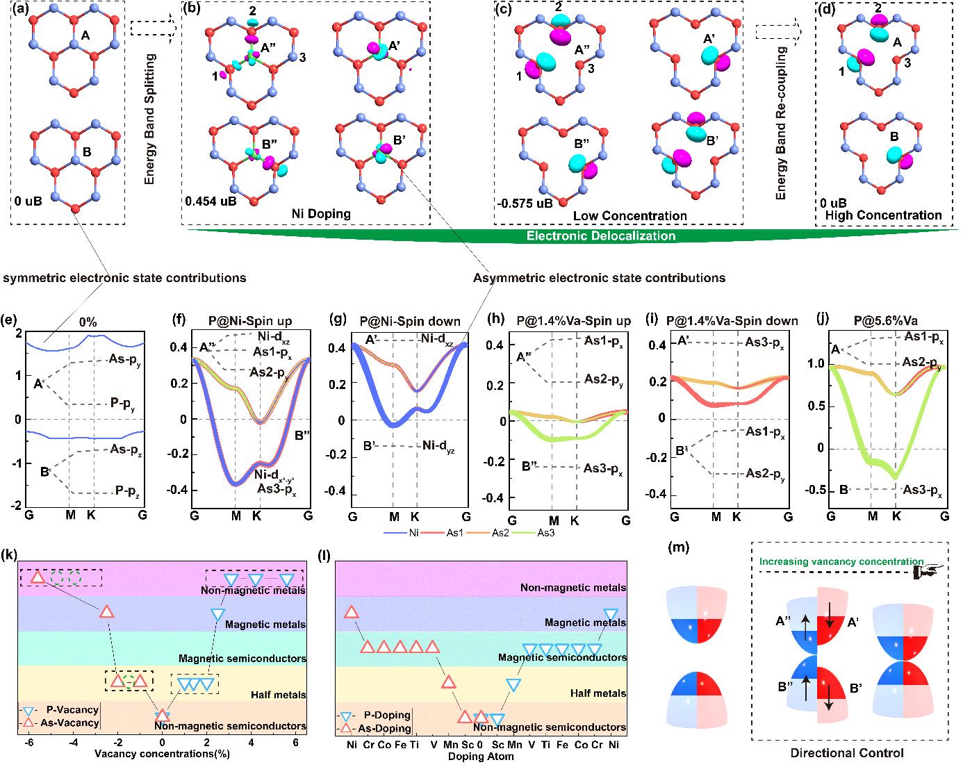 结果表明,As和P原子空位作为等效位点,可以导致β-AsP全电学性质转变,并且在不同空位浓度下初步探讨了半金属和金属性质转变的机理。这是由于空位位置最近的三个相邻原子所产生的电子离域和不对称电子态导致最高已占据分子轨道(HOMO)和最低未占据分子轨道(LUMO)向费米能级移动并发生自旋极化。这项工作表明,离域电子能够以“0”和“1”的创造性编码逻辑数字信息满足未来多样化的逻辑纳米器件。(理学院)