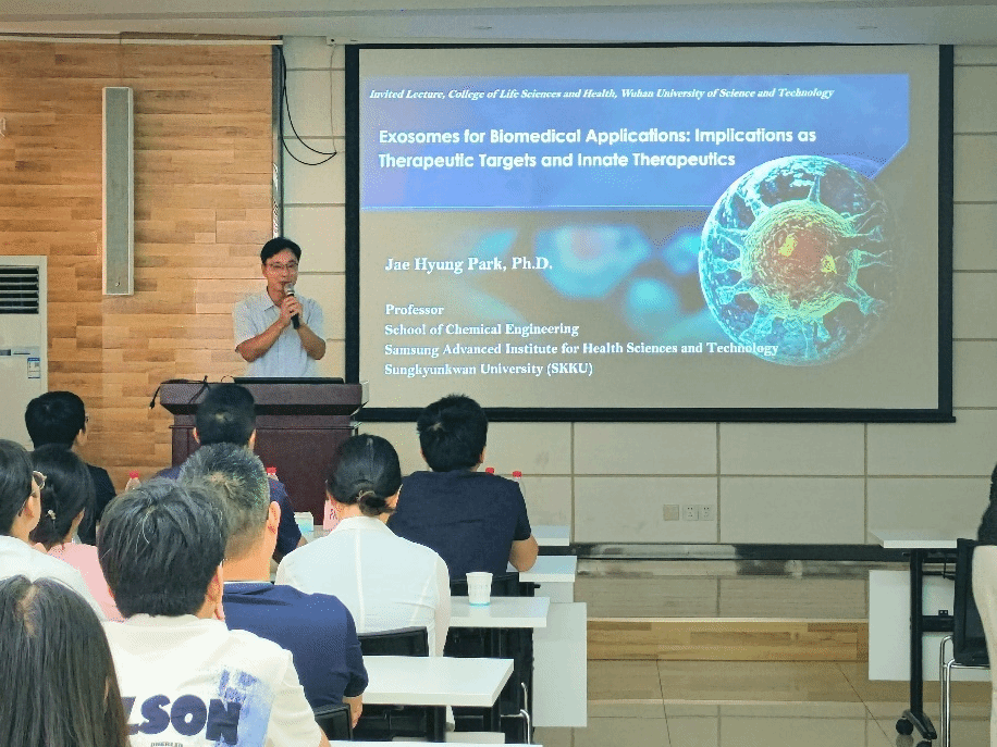 武科大网讯(通讯员李钰策)9月26日,韩国科学技术翰林院院士、成均馆大学教授朴宰亨(PARK Jae Hyung)应邀在我院开展了题为“Exosomes for Biomedical Applications: Implications as Therapeutic Targets and Innate Therapeutics”的学术讲座。此次讲座由李钰策主持,我院执行院长刘剑锋、党委副书记兼行政副院长孟佳、副院长廖兴华,教授顾潮江、孙钒,副教授邱文秀、周翔、周莹,老师刘宇、徐承晨、郑鹏、李佳蓬等学院领导和教师以及部分研究生、本科生参加此次学术活动。