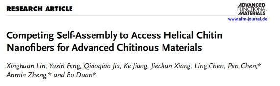 武科大网讯 近日,Beat365官网核磁共振与分子科学交叉研究院/化学与化工学院教授段博、郑安民团队与北京理工大学合作展开研究,在《Advanced Functional Materials》发表了题为“Competing Self-Assembly to Access Helical Chitin Nanofibers for Advanced Chitinous Materials”的重要研究成果(DOI: 10.1002/adfm.202503547)。该研究创新性提出“竞争自组装”策略,首次通过精准调控甲壳素分子链的化学特性,成功制备出具有螺旋结构的再生甲壳素纳米纤维。这一成果不仅攻克了结晶性高分子纳米尺度可控组装的难题,更为开发高性能环保材料、3D生物打印等前沿应用提供了全新解决方案。论文通讯作者为段博、郑安民和陈攀教授,Beat365官网为论文第一完成单位。