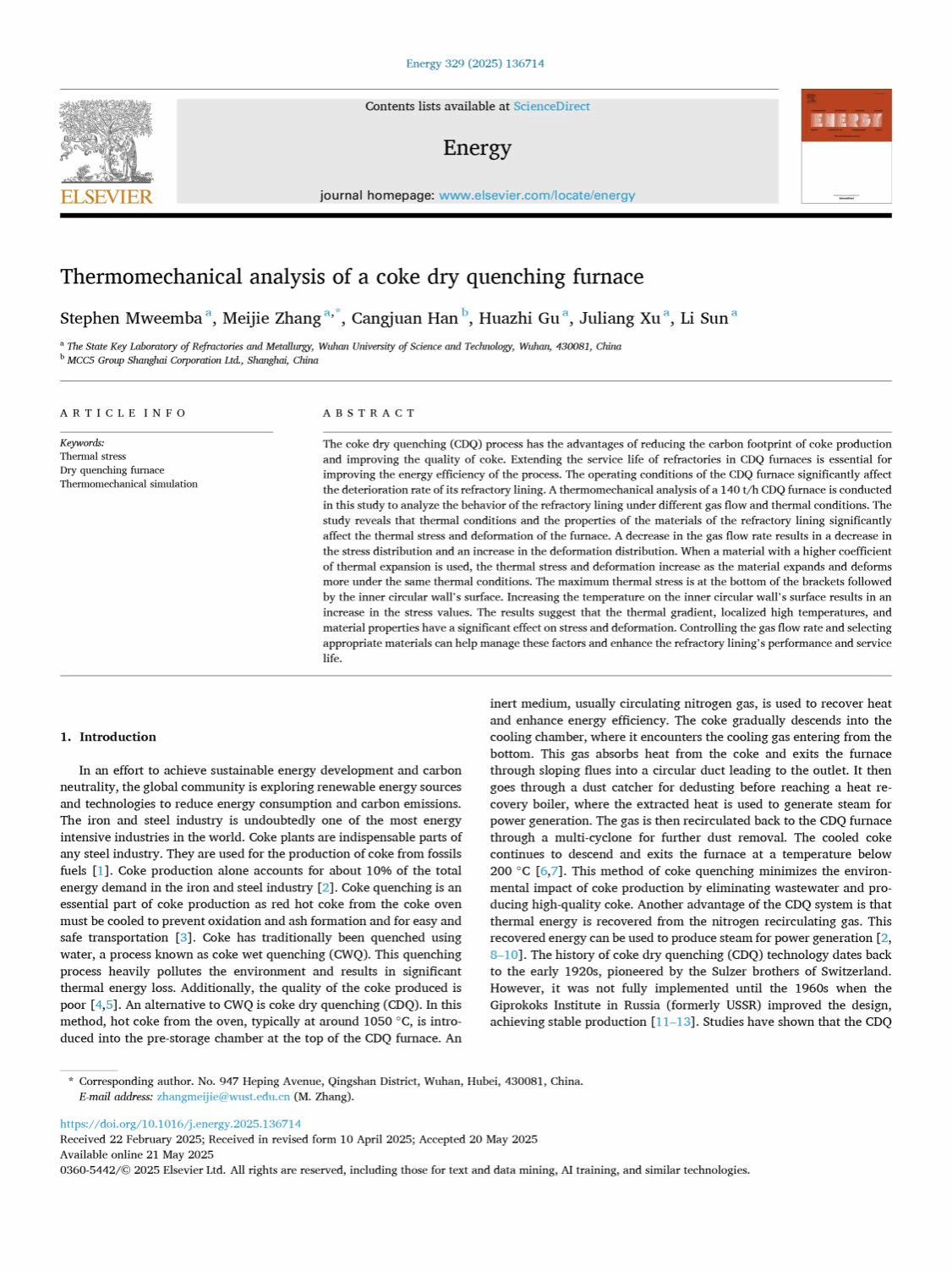武科大网讯 近日,Beat365官网材料学部顾华志、张美杰教授团队指导的留学生Stephen Mweemba,以第一作者身份在国际权威期刊《Energy》(影响因子:9;中科院工程技术大类一区)发表题为《Thermomechanical analysis of a coke dry quenching furnace》的高水平论文。