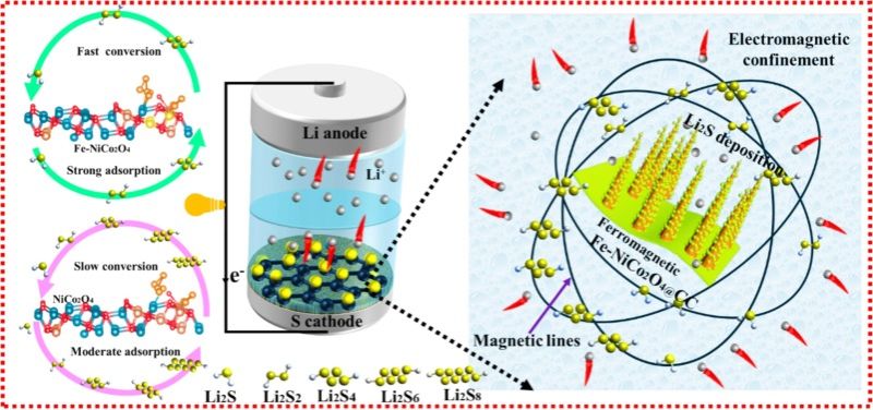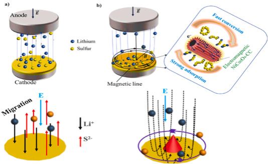 此外,Songwe Selabi Naomie Beolle近期在Energy发表的研究论文“Electromagnetic tuning for efficient polarization regulation and fast polysulfide conversion of Li-S battery”,进一步提出通过调控NiCo₂O₄纳米线尺寸和晶体结构,优化并利用材料内置磁场有效调节电解质/阴极界面反应活性与扩散路径,显著提升了电池性能,实现了0.1C条件下1496.1 mAh g⁻¹的比容量,具有重要的应用前景。