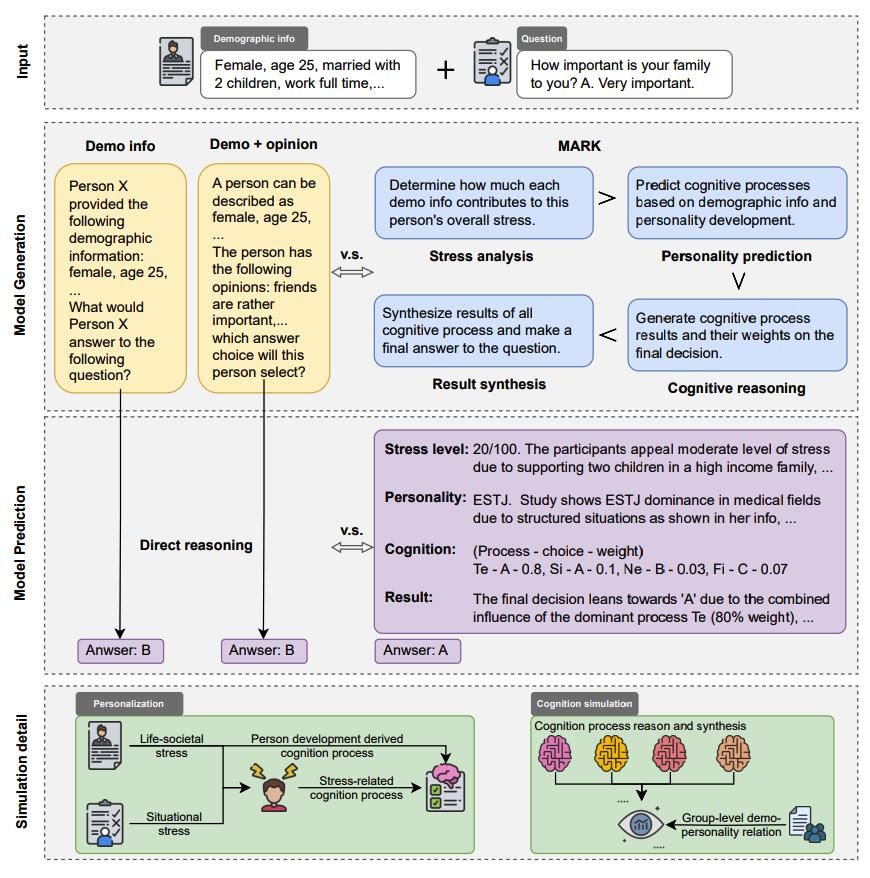 第三项研究,团队进一步将研究视角从宏观群体转向微观个体,系统反思了传统“人口标签”式提示策略可能导致的刻板印象风险。团队借鉴人格心理学理论,构建了名为MARK的多阶段认知推理框架(图3),通过先评估个体情境压力,再推断其认知功能偏好,进而模拟不同心理过程在问卷作答中的动态交互,最终输出兼具解释性与准确性的答案。在中美双文化数据集上的实验显示,该框架可将预测准确率提升约十个百分点,同时显著减少模型对性别、年龄等显性特征的机械依赖。
