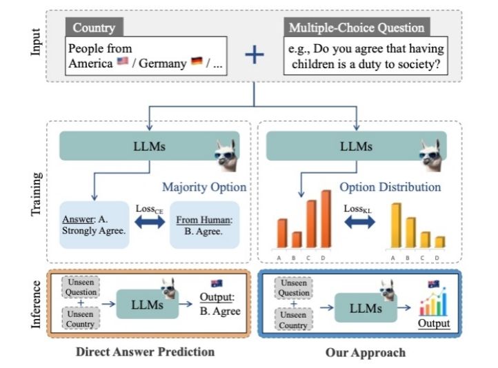 第二项研究,团队针对全球价值观调查所面临的高成本、长周期难题,提出了一种基于首词概率分布对齐的微调方法(图2),使大模型得以在未曾开展实地调查的国家与问卷上生成与人类统计特征高度一致的响应分布。实验覆盖世界价值观调查2017—2022周期65个国家、259道题目,结果表明该方法可将预测误差显著降低,并在完全未见的问题与国家场景上保持稳健,为跨文化社会研究提供了可迁移、可扩展的新范式。