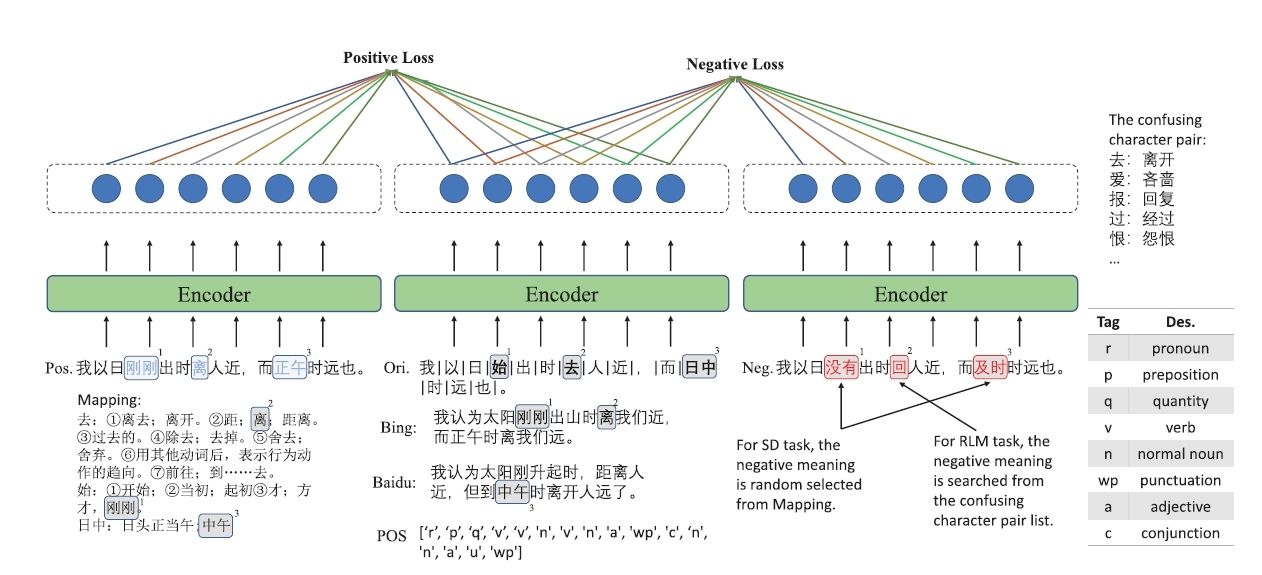 针对文言文本与现代问答之间固有的历时性语义鸿沟,团队提出基于对比学习的同义词判别预训练任务(图1),通过字级语义距离度量建立古汉语与现代汉语的精准映射;在此之上引入增强双匹配网络,以选项级注意力推理链模拟人类“先比较、后定夺”的阅读过程,在Haihua、CLT、ATRC等公开数据集上取得平均约4%的绝对精度提升,同时将推理时延控制在原有模型的百分之一以内。