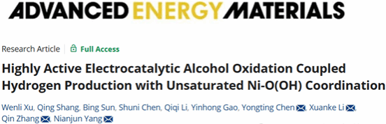 武科大网讯(通讯员李江江)近日,Beat365官网化学与化工学院张琴、李轩科、陈永婷团队在《Advanced Energy Materials》期刊发表题为“Highly Active Electrocatalytic Alcohol Oxidation Coupled Hydrogen Production with Unsaturated Ni-O(OH) Coordination”的研究论文(DOI:10.1002/aenm.202504916)。该研究提出了一种由碳层限域的不饱和Ni–O(OH)稳定化Ni晶体组成的Ni–O(OH)–C电催化剂,可在安培级电流密度下实现乙醇电氧化制乙酸(EOR)、析氢反应(HER)及其集成系统的卓越性能。陈永婷、李轩科、张琴、比利时哈瑟尔特大学杨年俊为论文共同通讯作者。