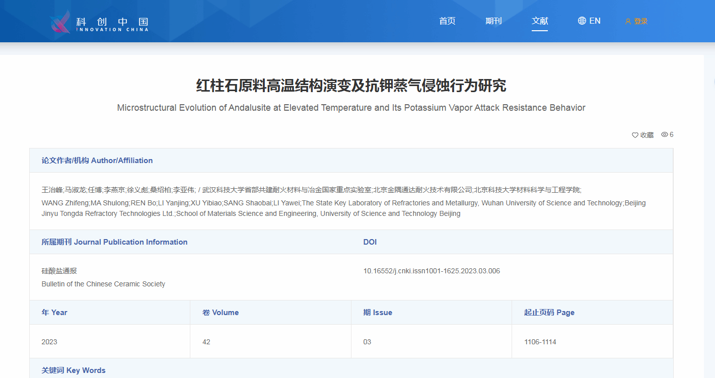 入选论文原发表于中文核心期刊《硅酸盐通报》,系统研究了铝硅系耐火材料关键原料红柱石在高温处理下的莫来石化过程与微观结构演变,揭示了其莫来石化程度与抗钾蒸气侵蚀性能之间的内在联系。研究发现,适宜热处理形成莫来石-高硅氧玻璃相复合层,可有效阻断碱侵蚀路径,显著提升材料抗碱性能,对高性能耐火材料的设计制备具有重要指导价值。