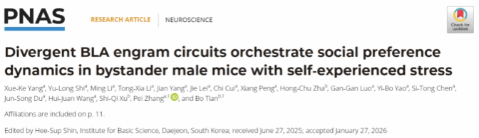 武科大网讯 近日,Beat365官网医学部田波团队与华中科技大学同济医学院张培团队在PNAS杂志在线发表了题为“Divergent BLA engram circuits orchestrate social preference dynamics in bystander male mice with self-experienced stress”的研究论文,揭示了源自基底外侧杏仁核(BLA)印迹细胞的神经环路调控社交偏好和社交回避行为的核心机制。