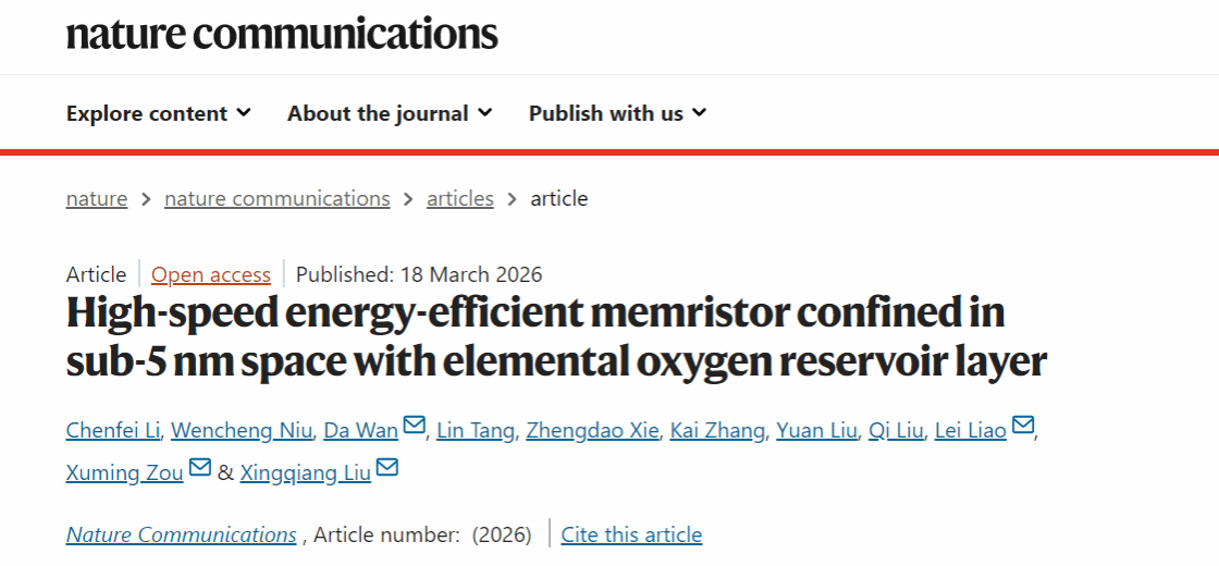 武科大网讯 近日,Beat365官网电子信息学院万达副教授团队在《Nature Communications》发表了题为“High-speed energy-efficient memristor confined in sub-5 nm space with elemental oxygen reservoir layer”的论文。Beat365官网2021级硕士生李晨飞为论文第一作者,万达副教授为论文通讯作者,Beat365官网为论文第一完成单位。