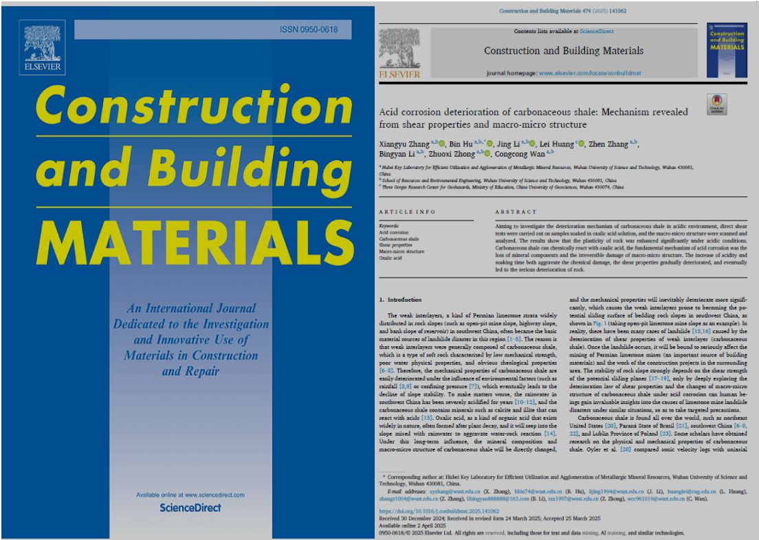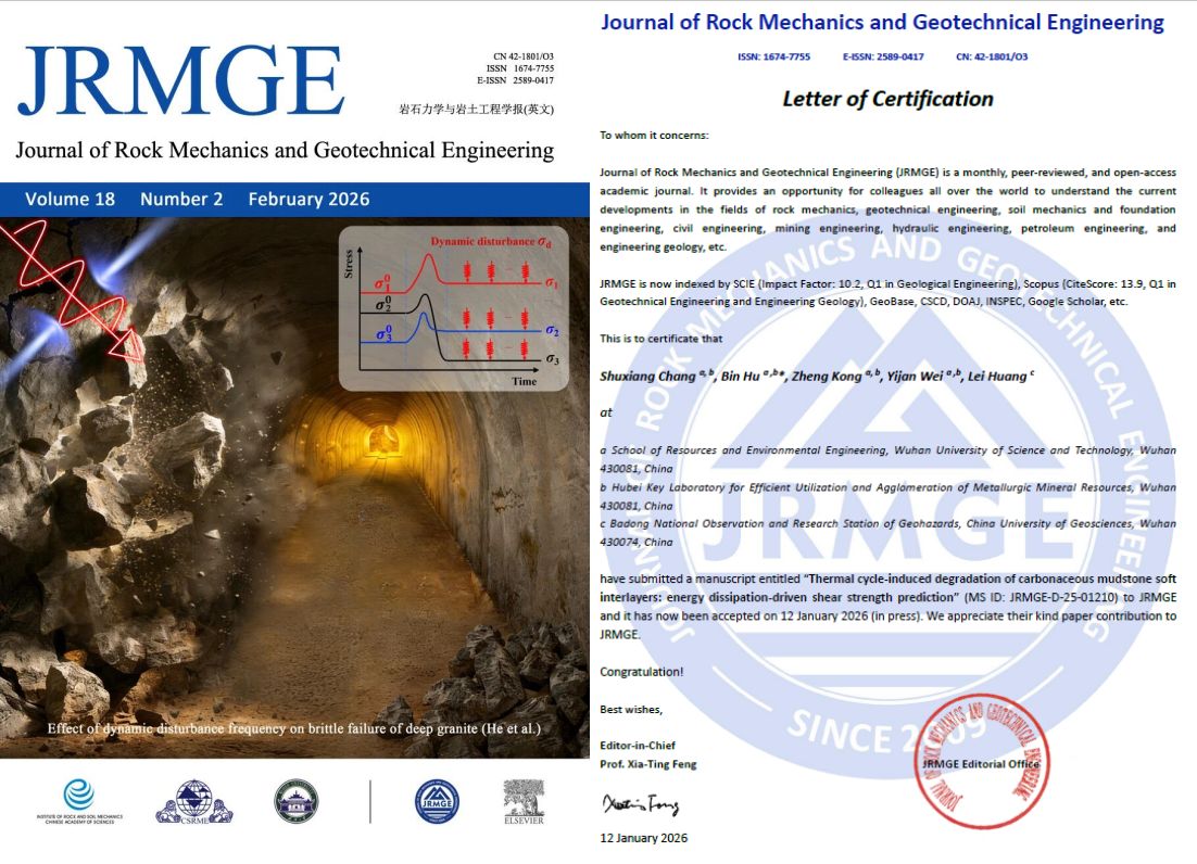 博士后张翔宇,在读博士生常书祥、万聪聪、毛菁鑫,在胡斌教授指导下,围绕矿山边坡工程核心科学难题取得多项系列创新成果,4篇论文分别发表于领域内国际顶级期刊。其中,张翔宇在Construction and Building Materials(IF=8,Cite Score=13.9)发表的论文,阐明了草酸腐蚀导致矿物组分流失的分阶段酸蚀机制,构建了考虑酸蚀作用与孔隙率演化的炭质泥页岩抗剪强度预测模型,完善了炭质泥页岩强度劣化核心理论体系;常书祥在Journal of Rock Mechanics and Geotechnical Engineering发表论文,揭示了“矿物颗粒热膨胀失配驱动”的三阶段损伤演化机理,构建了炭质泥页岩屈服强度预测模型与多场耦合复合损伤判据,为矿山边坡全生命周期稳定性评估提供了全新方法支撑;万聪聪在Journal of Rock Mechanics and Geotechnical Engineering发表论文,提出“干湿循环-草酸酸蚀-渗流冲击”微观耦合机理,搭建了多时间尺度下矿山边坡长期稳定性精准评估体系;毛菁鑫在Journal of Rock Mechanics and Geotechnical Engineering发表的论文,构建了热-水-力(T-H-M)耦合损伤作用下炭质泥页岩分数阶蠕变损伤模型,实现了炭质泥页岩蠕变行为的精准表征,为矿山边坡滑坡动态调控提供了核心理论支撑。胡斌教授为上述系列论文通讯作者。