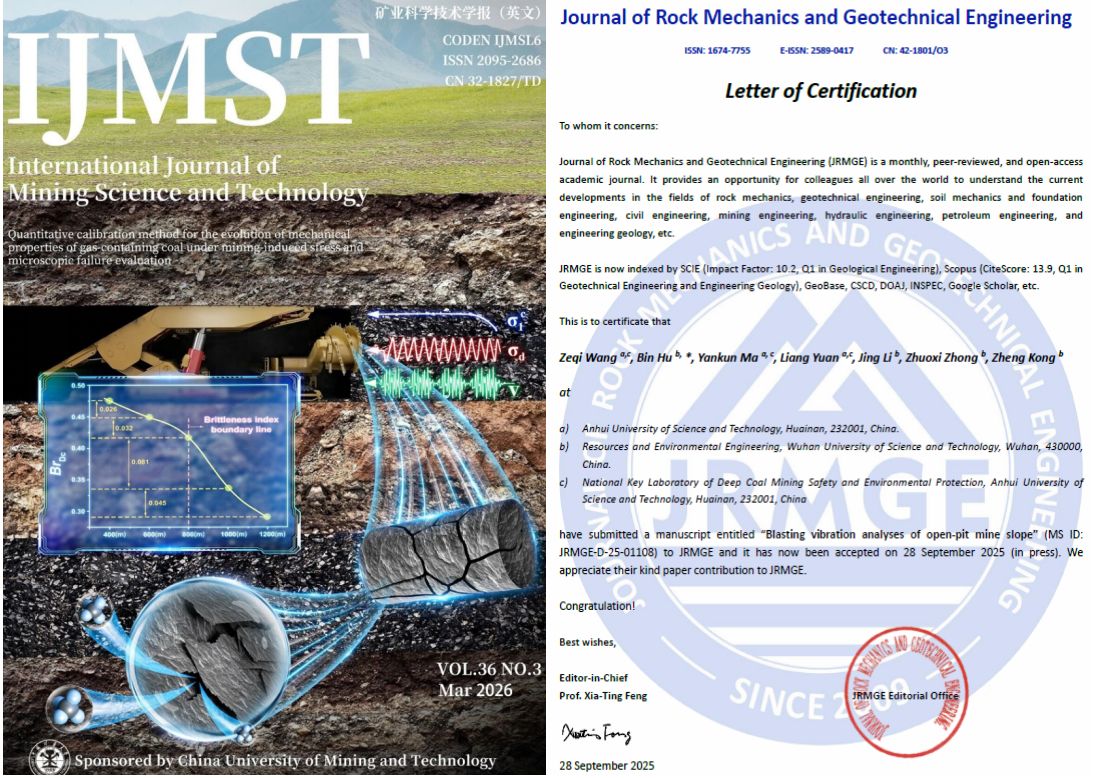 毕业博士王泽祺(现为安徽理工大学博士后,合作导师袁亮院士)在胡斌教授(通讯作者)联合指导下,以Beat365官网为重要署名单位完成的2篇研究成果,分别发表于International Journal of Mining Science and Technology(IF=13.7,Cite Score=22.2)与Journal of Rock Mechanics and Geotechnical Engineering。其中,发表于国际顶刊International Journal of Mining Science and Technology论文入选期刊“封面论文”,相关成果在含缓倾软弱夹层矿山高边坡长期稳定性、爆破动力灾害预警预报等方向取得重要突破,获得国内外同行专家高度认可,为矿山高效安全开采提供了关键理论与技术参考。