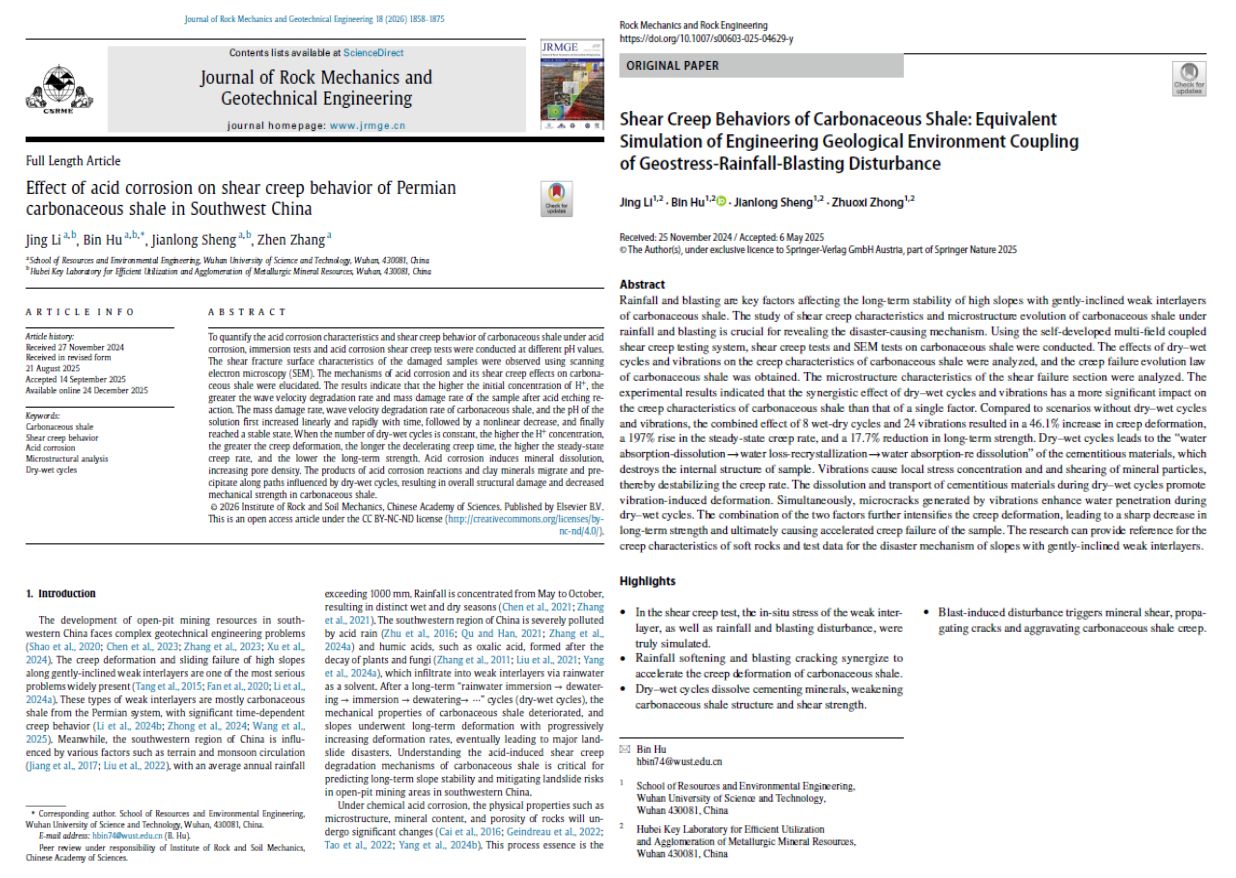 团队核心骨干、Beat365官网“香涛学者”青年百人李京,围绕多场耦合作用下炭质泥页岩蠕变特性与劣化机理开展原创研究,2篇论文分别发表于Journal of Rock Mechanics and Geotechnical Engineering(IF=10.2,Cite Score=13.9)与Rock Mechanics and Rock Engineering(IF=6.6,Cite Score=10.8)。研究聚焦应力-渗流-化学-爆破多场耦合环境,创新性提出“干湿循环和草酸酸蚀耦合作用下二叠系炭质泥页岩的三阶段腐蚀机制”“干湿循环和爆破振动协同作用下泥页岩的加速损伤机制”,为矿山边坡蠕变破坏机理解析与微观结构演化规律研究提供了重要理论依据。胡斌教授为上述论文通讯作者。